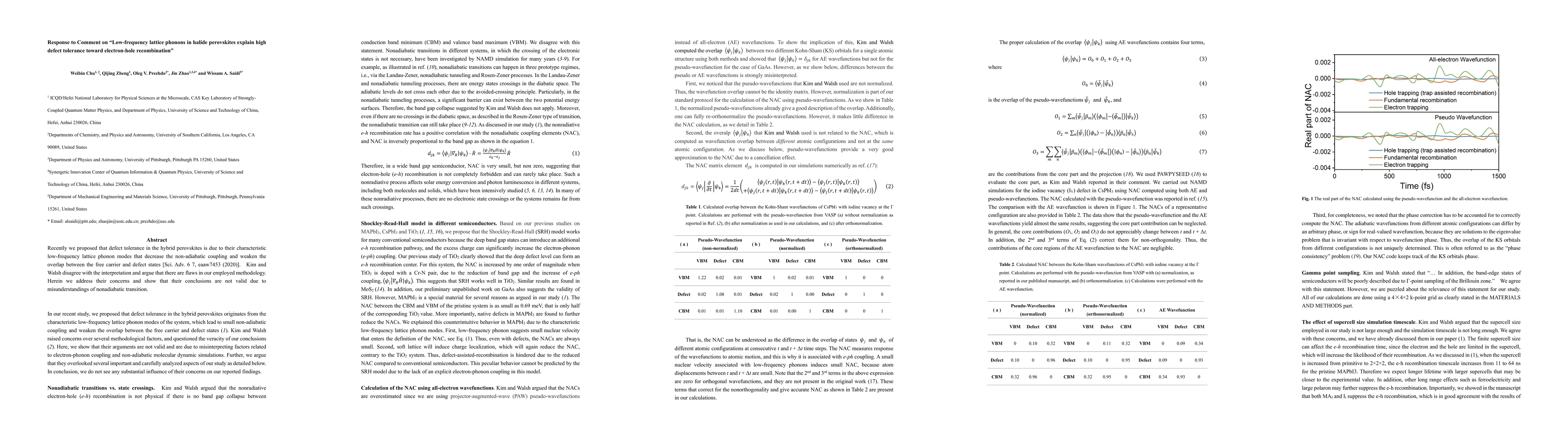 Recently we proposed that defect tolerance in the hybrid perovskites is due to their characteristic low-frequency lattice phonon modes that decrease the non-adiabatic coupling and weaken the overlap between the free carrier and defect states [Sci. Adv. 6 7, eaaw7453 (2020)]. Kim and Walsh disagree with the interpretation and argue that there are flaws in our employed methodology. Herein we address their concerns and show that their conclusions are not valid due to misunderstandings of nonadiabatic transition.