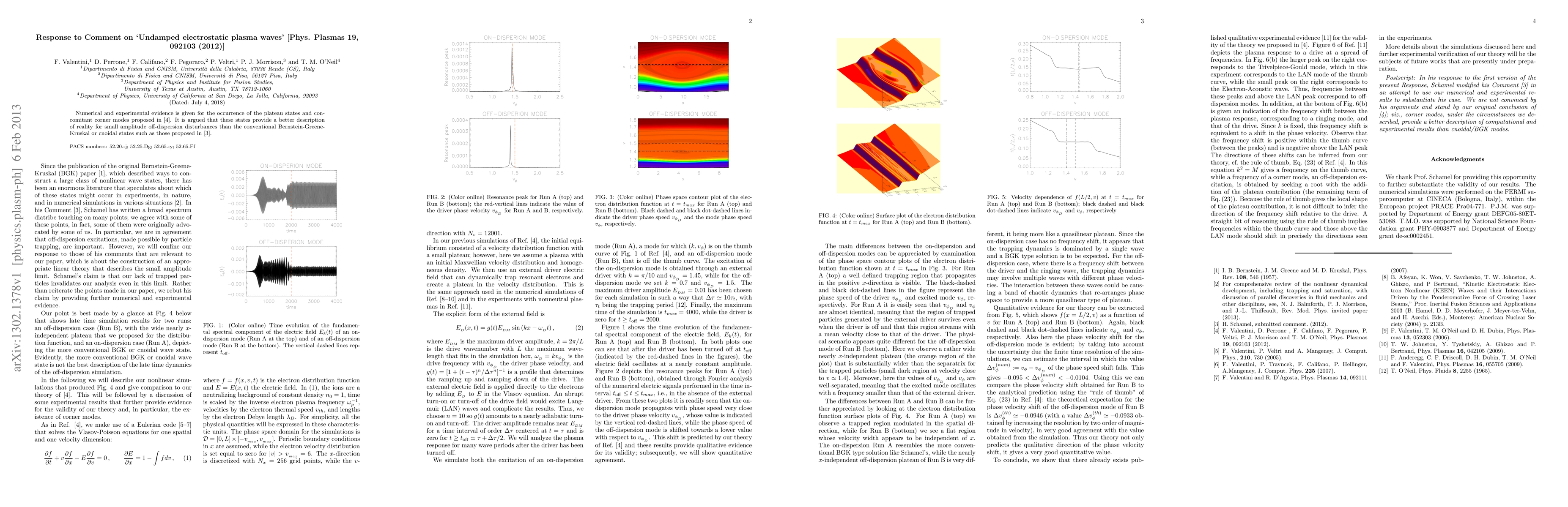 Numerical and experimental evidence is given for the occurrence of the plateau states and concomitant corner modes proposed in \cite{valentini12}. It is argued that these states provide a better description of reality for small amplitude off-dispersion disturbances than the conventional Bernstein-Greene-Kruskal or cnoidal states such as those proposed in \cite{comment}