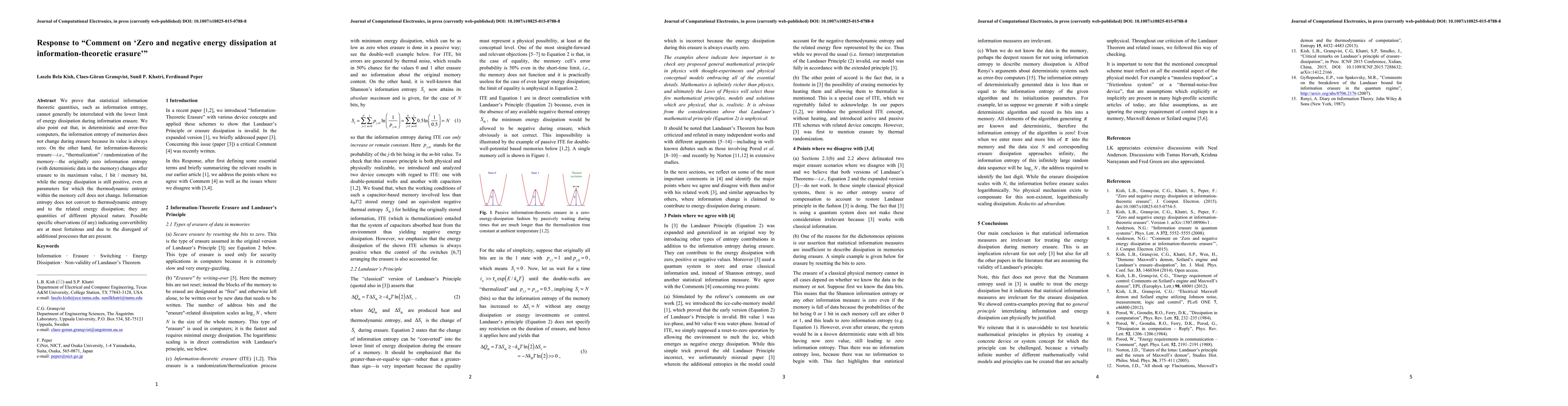 We prove that statistical information theoretic quantities, such as information entropy, cannot generally be interrelated with the lower limit of energy dissipation during information erasure. We also point out that, in deterministic and error-free computers, the information entropy of memories does not change during erasure because its value is always zero. On the other hand, for information-theoretic erasure - i.e., "thermalization" / randomization of the memory - the originally zero information entropy (with deterministic data in the memory) changes after erasure to its maximum value, 1 bit / memory bit, while the energy dissipation is still positive, even at parameters for which the thermodynamic entropy within the memory cell does not change. Information entropy does not convert to thermodynamic entropy and to the related energy dissipation; they are quantities of different physical nature. Possible specific observations (if any) indicating convertibility are at most fortuitous and due to the disregard of additional processes that are present.