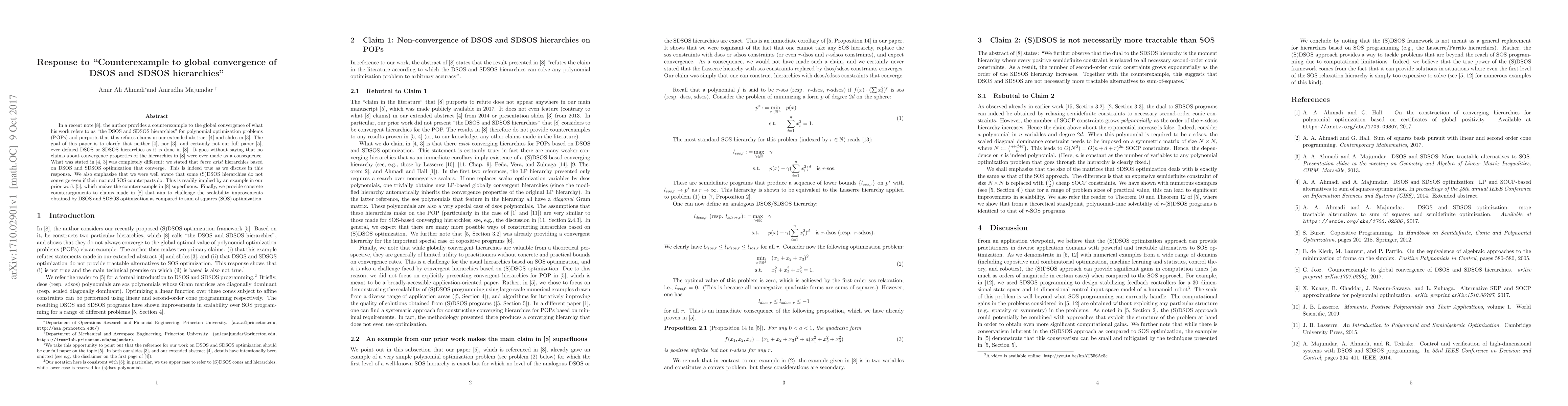 In a recent note [8], the author provides a counterexample to the global convergence of what his work refers to as "the DSOS and SDSOS hierarchies" for polynomial optimization problems (POPs) and purports that this refutes claims in our extended abstract [4] and slides in [3]. The goal of this paper is to clarify that neither [4], nor [3], and certainly not our full paper [5], ever defined DSOS or SDSOS hierarchies as it is done in [8]. It goes without saying that no claims about convergence properties of the hierarchies in [8] were ever made as a consequence. What was stated in [4,3] was completely different: we stated that there exist hierarchies based on DSOS and SDSOS optimization that converge. This is indeed true as we discuss in this response. We also emphasize that we were well aware that some (S)DSOS hierarchies do not converge even if their natural SOS counterparts do. This is readily implied by an example in our prior work [5], which makes the counterexample in [8] superfluous. Finally, we provide concrete counterarguments to claims made in [8] that aim to challenge the scalability improvements obtained by DSOS and SDSOS optimization as compared to sum of squares (SOS) optimization. [3] A. A. Ahmadi and A. Majumdar. DSOS and SDSOS: More tractable alternatives to SOS. Slides at the meeting on Geometry and Algebra of Linear Matrix Inequalities, CIRM, Marseille, 2013. [4] A. A. Ahmadi and A. Majumdar. DSOS and SDSOS optimization: LP and SOCP-based alternatives to sum of squares optimization. In proceedings of the 48th annual IEEE Conference on Information Sciences and Systems, 2014. [5] A. A. Ahmadi and A. Majumdar. DSOS and SDSOS optimization: more tractable alternatives to sum of squares and semidefinite optimization. arXiv:1706.02586, 2017. [8] C. Josz. Counterexample to global convergence of DSOS and SDSOS hierarchies. arXiv:1707.02964, 2017.