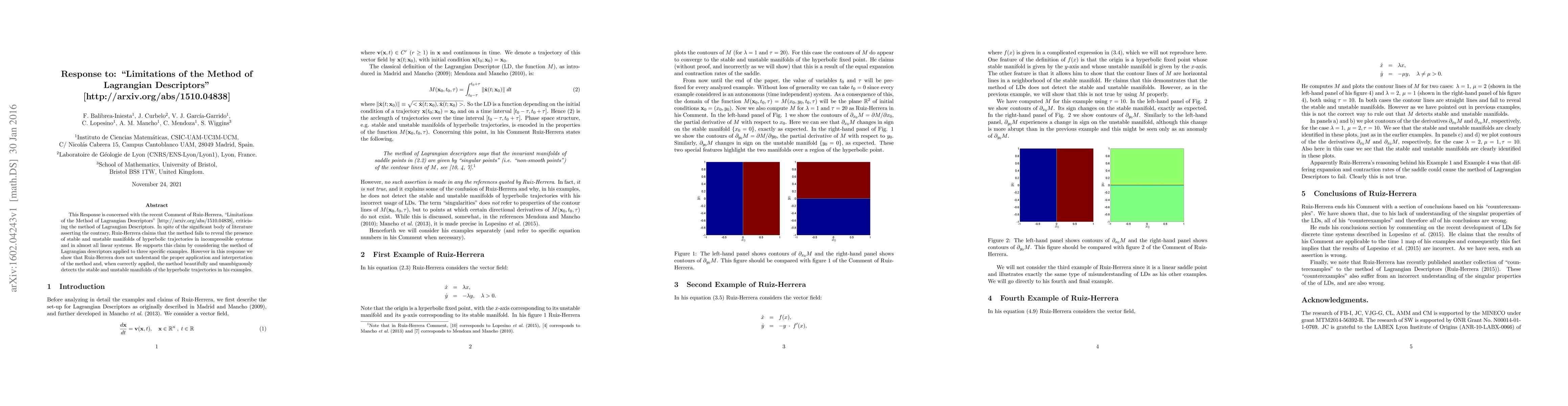This Response is concerned with the recent Comment of Ruiz-Herrera, "Limitations of the Method of Lagrangian Descriptors" [arXiv:1510.04838], criticising the method of Lagrangian Descriptors. In spite of the significant body of literature asserting the contrary, Ruiz-Herrera claims that the method fails to reveal the presence of stable and unstable manifolds of hyperbolic trajectories in incompressible systems and in almost all linear systems. He supports this claim by considering the method of Lagrangian descriptors applied to three specific examples. However in this response we show that Ruiz-Herrera does not understand the proper application and interpretation of the method and, when correctly applied, the method beautifully and unambiguously detects the stable and unstable manifolds of the hyperbolic trajectories in his examples.