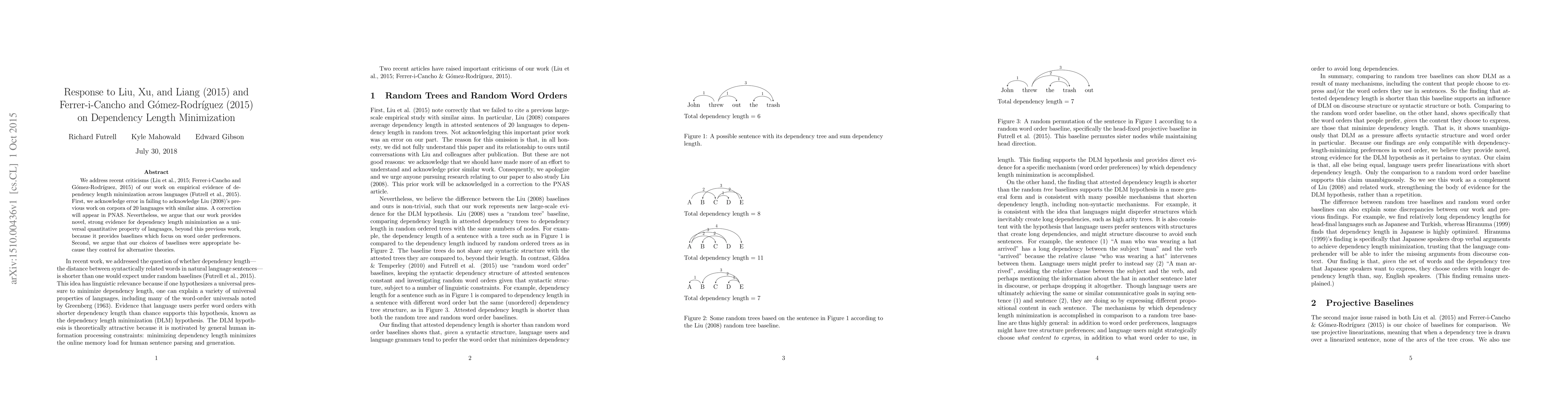 This paper responds to critiques of Futrell et al. (2015) regarding dependency length minimization, acknowledging an oversight in not citing Liu (2008) and defending the robustness of their findings through appropriate baseline selection to control for alternative theories.