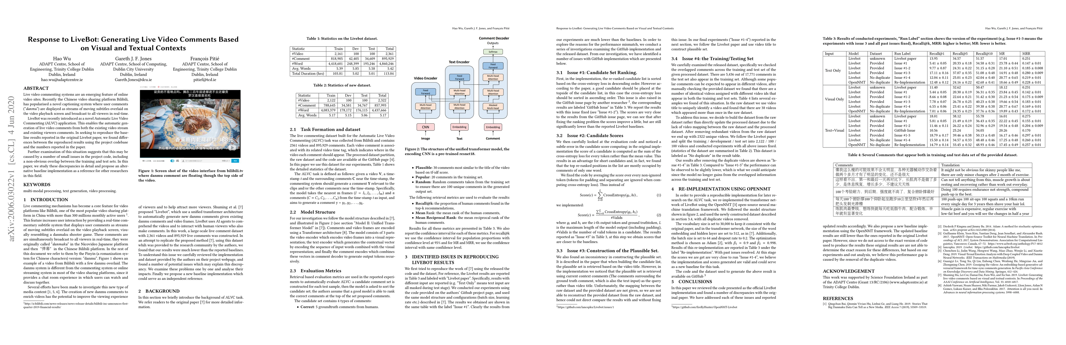 Live video commenting systems are an emerging feature of online video sites. Recently the Chinese video sharing platform Bilibili, has popularised a novel captioning system where user comments are displayed as streams of moving subtitles overlaid on the video playback screen and broadcast to all viewers in real-time. LiveBot was recently introduced as a novel Automatic Live Video Commenting (ALVC) application. This enables the automatic generation of live video comments from both the existing video stream and existing viewers comments. In seeking to reproduce the baseline results reported in the original Livebot paper, we found differences between the reproduced results using the project codebase and the numbers reported in the paper. Further examination of this situation suggests that this may be caused by a number of small issues in the project code, including a non-obvious overlap between the training and test sets. In this paper, we study these discrepancies in detail and propose an alternative baseline implementation as a reference for other researchers in this field.