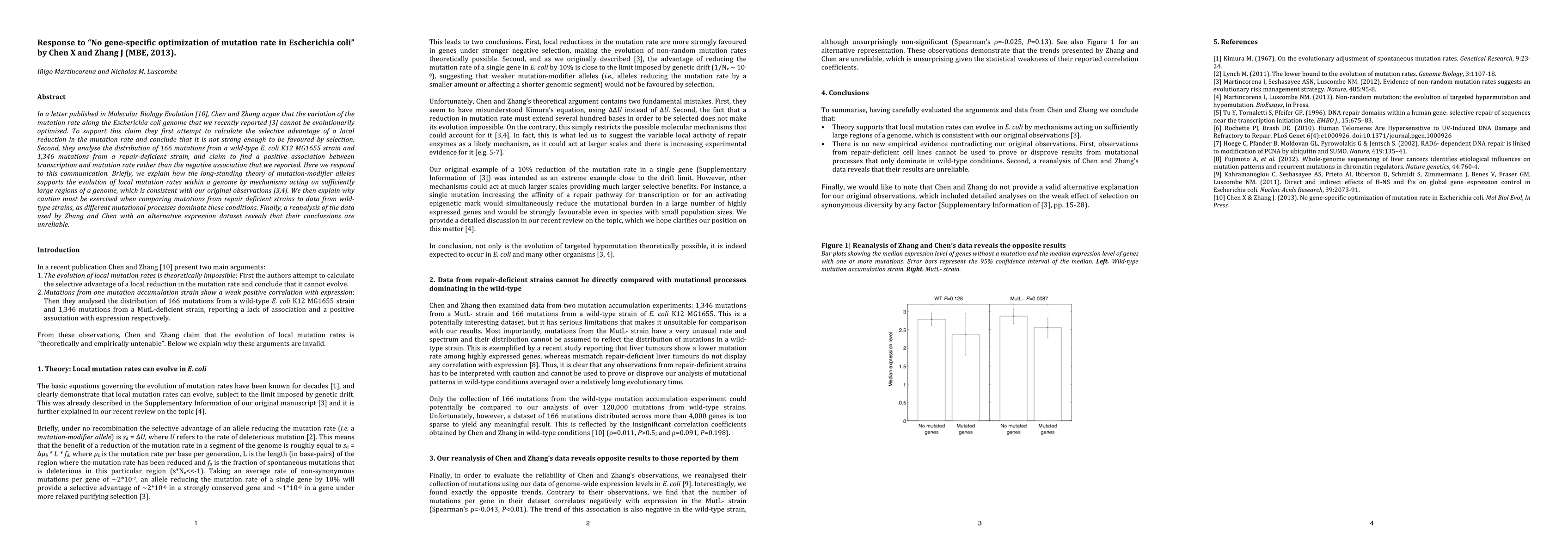 The authors refute Chen and Zhang's claims about mutation rate optimization in E. coli genome, citing mutation-modifier allele theory and re-analysis of mutation data. They argue for local mutation rate evolution within genomes and caution against comparing repair-deficient and wild-type strain mutations.