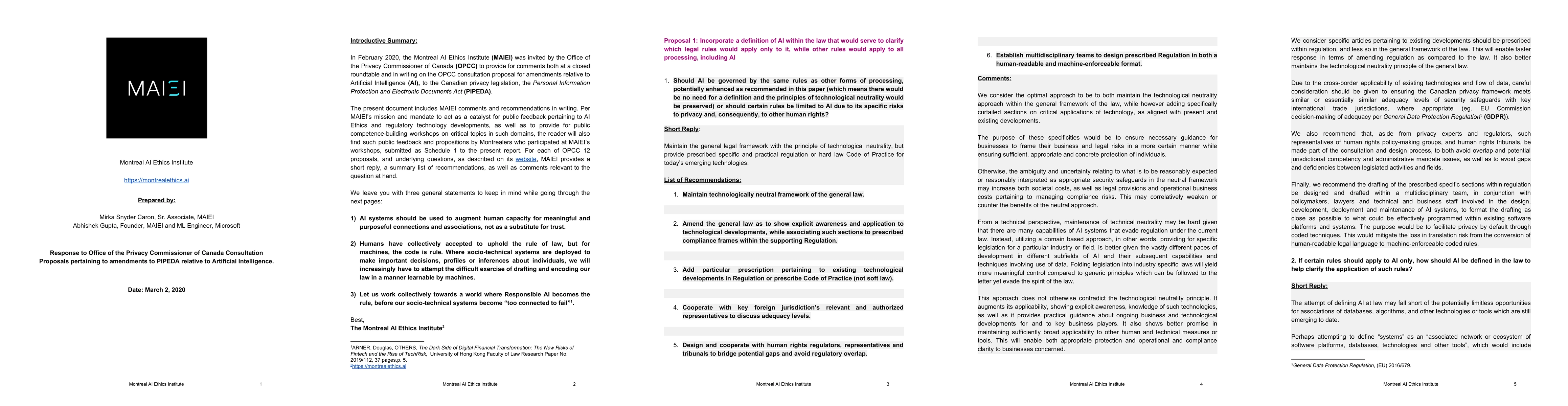 In February 2020, the Montreal AI Ethics Institute (MAIEI) was invited by the Office of the Privacy Commissioner of Canada (OPCC) to provide for comments both at a closed roundtable and in writing on the OPCC consultation proposal for amendments relative to Artificial Intelligence (AI), to the Canadian privacy legislation, the Personal Information Protection and Electronic Documents Act (PIPEDA). The present document includes MAIEI comments and recommendations in writing. Per MAIEI's mission and mandate to act as a catalyst for public feedback pertaining to AI Ethics and regulatory technology developments, as well as to provide for public competence-building workshops on critical topics in such domains, the reader will also find such public feedback and propositions by Montrealers who participated at MAIEI's workshops, submitted as Schedule 1 to the present report. For each of OPCC 12 proposals, and underlying questions, as described on its website, MAIEI provides a short reply, a summary list of recommendations, as well as comments relevant to the question at hand. We leave you with three general statements to keep in mind while going through the next pages: 1) AI systems should be used to augment human capacity for meaningful and purposeful connections and associations, not as a substitute for trust. 2) Humans have collectively accepted to uphold the rule of law, but for machines, the code is rule. Where socio-technical systems are deployed to make important decisions, profiles or inferences about individuals, we will increasingly have to attempt the difficult exercise of drafting and encoding our law in a manner learnable by machines. 3) Let us work collectively towards a world where Responsible AI becomes the rule, before our socio-technical systems become "too connected to fail".