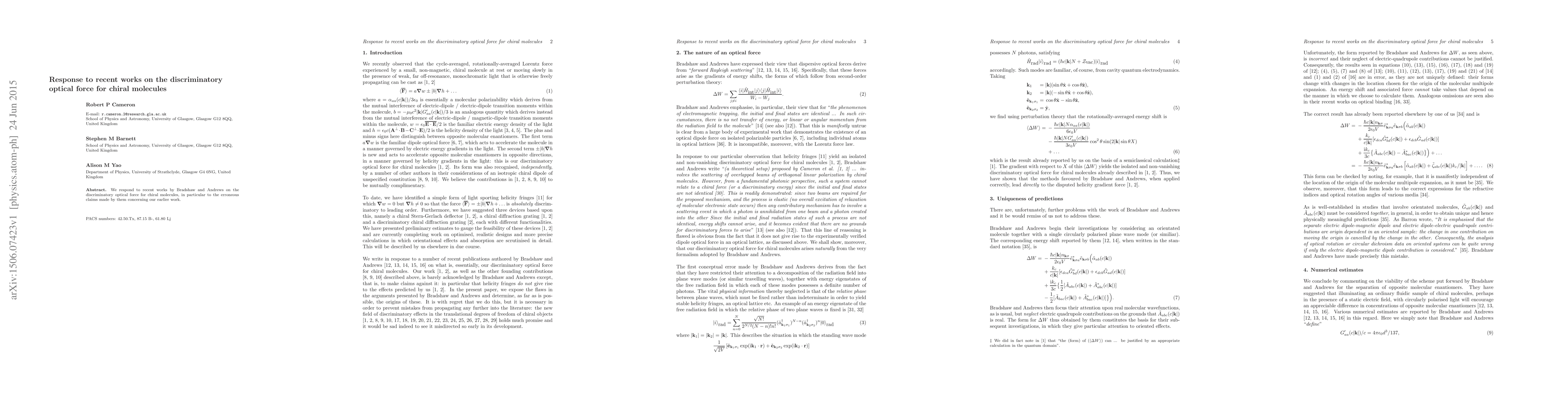 We respond to recent works by Bradshaw and Andrews on the discriminatory optical force for chiral molecules, in particular to the erroneous claims made by them concerning our earlier work.