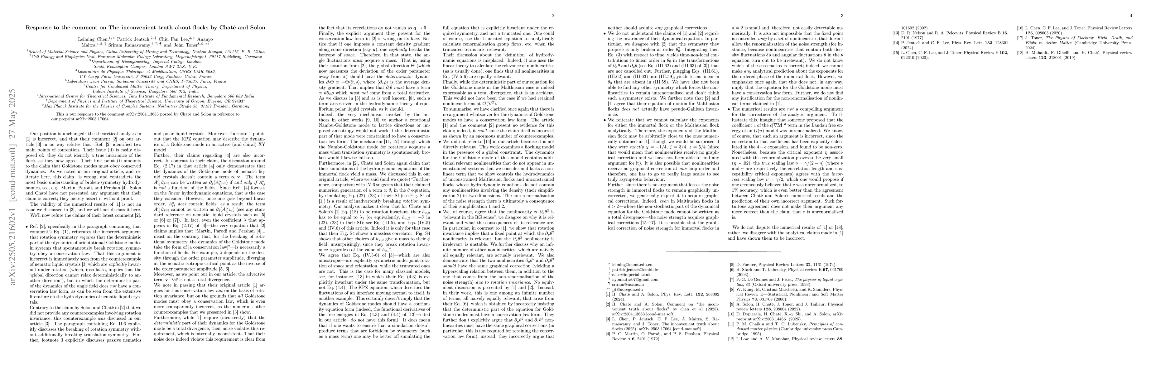 The authors respond to Chaté and Solon's comment on their preprint arXiv:2503.17064, addressing points raised in their comment on arXiv:2504.13683 within the categories of cond-mat.soft and cond-mat.stat-mech.