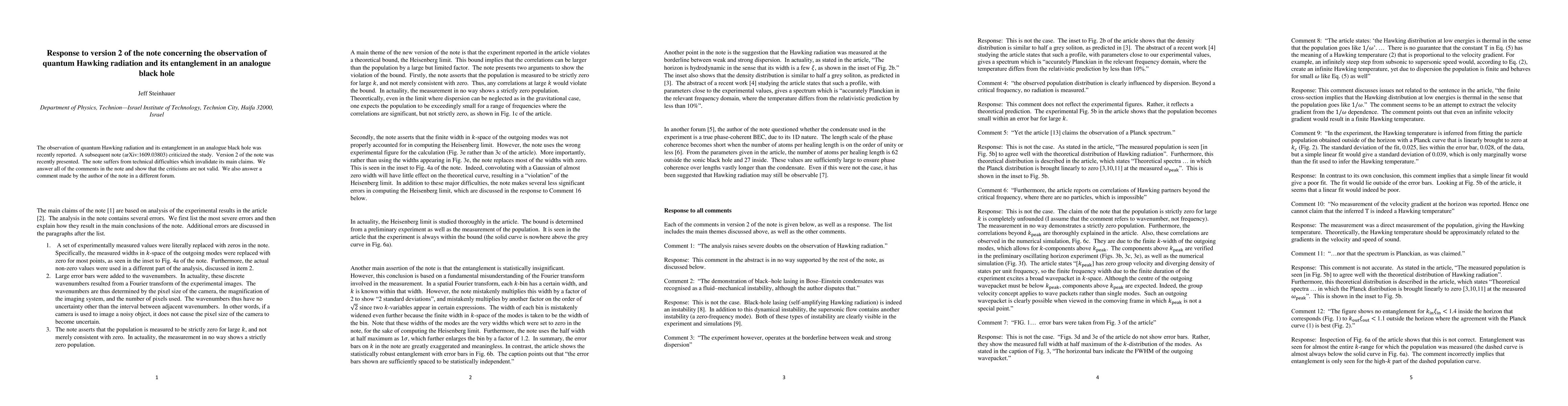 The observation of quantum Hawking radiation and its entanglement in an analogue black hole was recently reported. A subsequent note (arXiv:1609.03803) criticized the study. Version 2 of the note was recently presented. The note suffers from technical difficulties which invalidate its main claims. We answer all of the comments in the note and show that the criticisms are not valid. We also answer a comment made by the author of the note in a different forum.