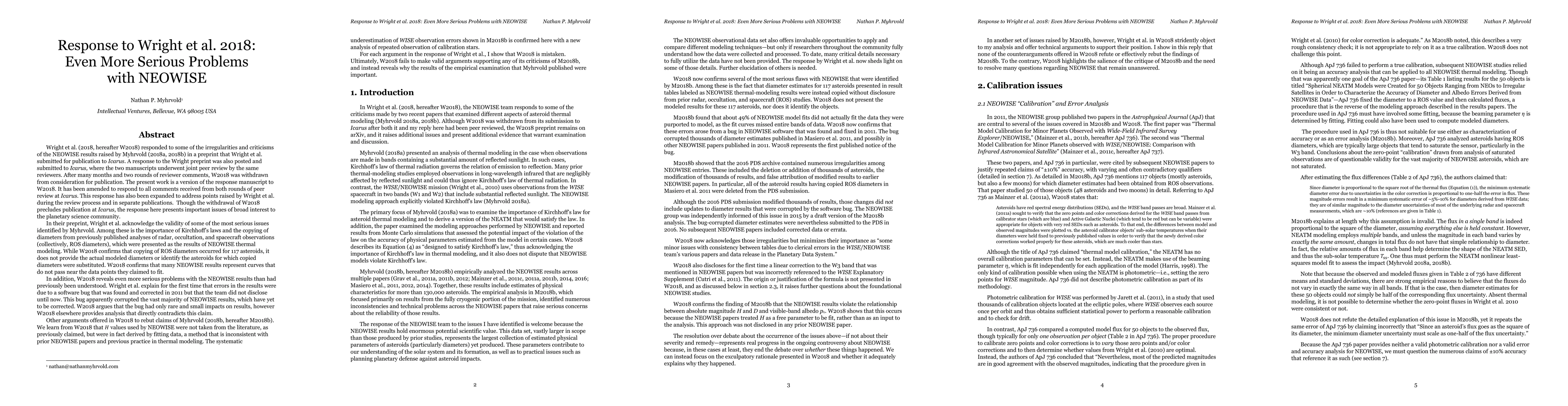 Wright et al. 2018 (W2018) responded to certain criticisms of the NEOWISE results raised by Myhrvold (2018a, 2018b) in a preprint submitted for publication to Icarus. This paper responds to W2018 and has been updated to address comments from two rounds of peer review at Icarus. Points raised by Wright et al. during peer review and in recent publications are also addressed. The response here presents issues of broad interest to the planetary science community. W2018 acknowledges some of the most serious issues identified by Myhrvold, including the importance of Kirchhoff's law and the misrepresentation of diameters copied from previous radar, occultation, and spacecraft observations as NEOWISE thermal modeling results. W2018 confirms copying ROS diameters for 117 asteroids but does not report actual modeled diameters or the identity of the asteroids involved. W2018 confirms that many NEOWISE "fit" curves do not pass near the data points they claimed to fit. W2018 reveals more serious problems with NEOWISE results than had previously been understood. Wright et al. belatedly disclose a software bug, found and corrected in 2011, that apparently corrupted the vast majority of NEOWISE results, which have yet to be corrected. W2018 asserts that the bug had rare and small impacts on results but elsewhere provides analysis that directly contradicts this claim. We learn from W2018 that H values used by NEOWISE were not taken from the literature, as claimed, but rather derived by fitting data, a method inconsistent with prior NEOWISE papers and practice in thermal modeling. The systematic underestimation of WISE observation errors shown in Myhrvold 2018b is confirmed with a new analysis of repeated observation of calibration stars. Each argument in W2018 is shown here to be mistaken. Ultimately, W2018 reveals why the results of the empirical examination that Myhrvold published were important.