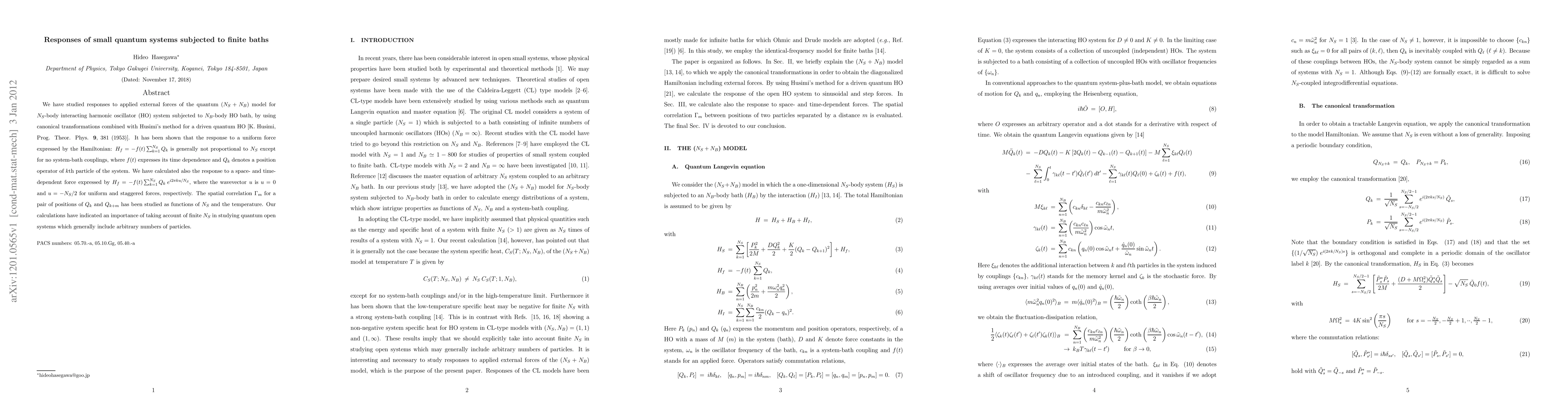 We have studied responses to applied external forces of the quantum $(N_S+N_B)$ model for $N_S$-body interacting harmonic oscillator (HO) system subjected to $N_B$-body HO bath, by using canonical transformations combined with Husimi's method for a driven quantum HO [K. Husimi, Prog. Theor. Phys. {\bf 9}, 381 (1953)]. It has been shown that the response to a uniform force expressed by the Hamiltonian: $H_f= -f(t) \sum_{k=1}^{N_S} Q_k$ is generally not proportional to $N_S$ except for no system-bath couplings, where $f(t)$ expresses its time dependence and $Q_k$ denotes a position operator of $k$th particle of the system. We have calculated also the response to a space- and time-dependent force expressed by $H_f= -f(t) \sum_{k=1}^{N_S} Q_k \: e^{i 2 \pi k u/N_S}$, where the wavevector $u$ is $u=0$ and $u=-N_S/2$ for uniform and staggered forces, respectively. The spatial correlation $\Gamma_m$ for a pair of positions of $Q_k$ and $Q_{k+m}$ has been studied as functions of $N_S$ and the temperature. Our calculations have indicated an importance of taking account of finite $N_S$ in studying quantum open systems which generally include arbitrary numbers of particles.