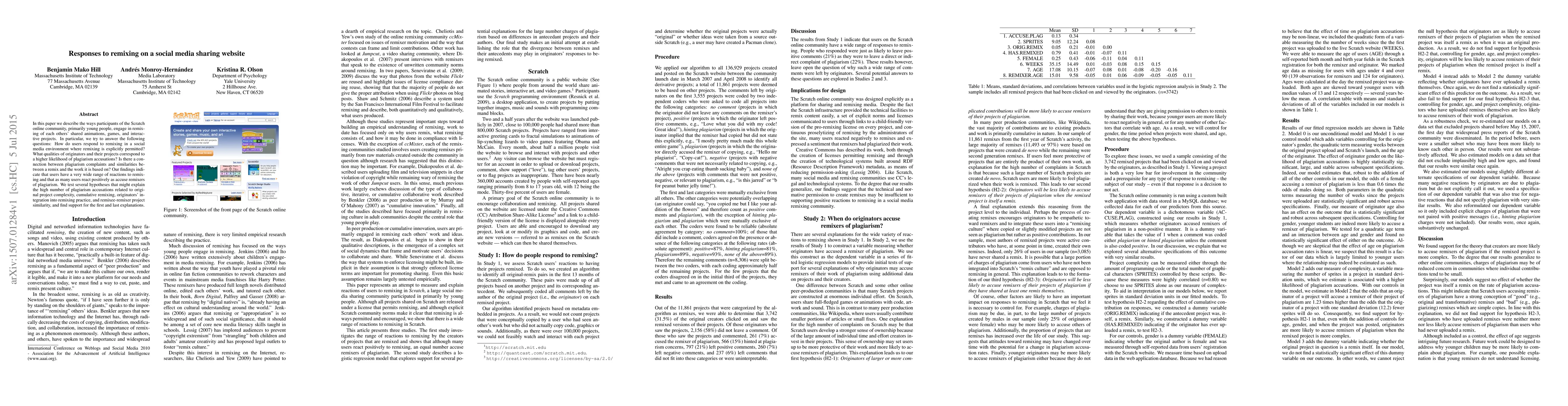 In this paper we describe the ways participants of the Scratch online community, primarily young people, engage in remixing of each others' shared animations, games, and interactive projects. In particular, we try to answer the following questions: How do users respond to remixing in a social media environment where remixing is explicitly permitted? What qualities of originators and their projects correspond to a higher likelihood of plagiarism accusations? Is there a connection between plagiarism complaints and similarities between a remix and the work it is based on? Our findings indicate that users have a very wide range of reactions to remixing and that as many users react positively as accuse remixers of plagiarism. We test several hypotheses that might explain the high number of plagiarism accusations related to original project complexity, cumulative remixing, originators' integration into remixing practice, and remixee-remixer project similarity, and find support for the first and last explanations.