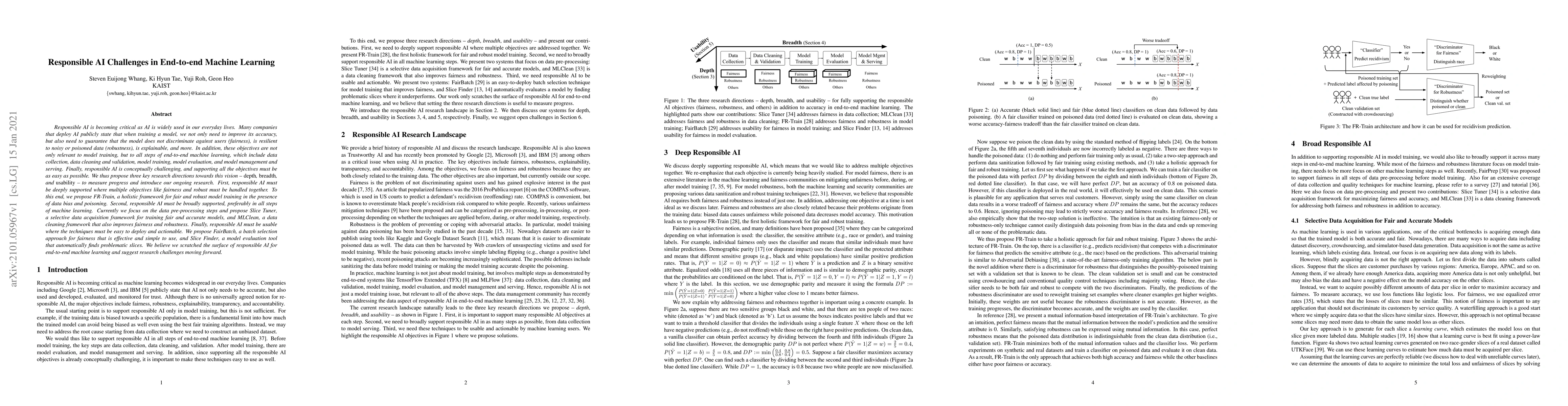 Responsible AI is becoming critical as AI is widely used in our everyday lives. Many companies that deploy AI publicly state that when training a model, we not only need to improve its accuracy, but also need to guarantee that the model does not discriminate against users (fairness), is resilient to noisy or poisoned data (robustness), is explainable, and more. In addition, these objectives are not only relevant to model training, but to all steps of end-to-end machine learning, which include data collection, data cleaning and validation, model training, model evaluation, and model management and serving. Finally, responsible AI is conceptually challenging, and supporting all the objectives must be as easy as possible. We thus propose three key research directions towards this vision - depth, breadth, and usability - to measure progress and introduce our ongoing research. First, responsible AI must be deeply supported where multiple objectives like fairness and robust must be handled together. To this end, we propose FR-Train, a holistic framework for fair and robust model training in the presence of data bias and poisoning. Second, responsible AI must be broadly supported, preferably in all steps of machine learning. Currently we focus on the data pre-processing steps and propose Slice Tuner, a selective data acquisition framework for training fair and accurate models, and MLClean, a data cleaning framework that also improves fairness and robustness. Finally, responsible AI must be usable where the techniques must be easy to deploy and actionable. We propose FairBatch, a batch selection approach for fairness that is effective and simple to use, and Slice Finder, a model evaluation tool that automatically finds problematic slices. We believe we scratched the surface of responsible AI for end-to-end machine learning and suggest research challenges moving forward.