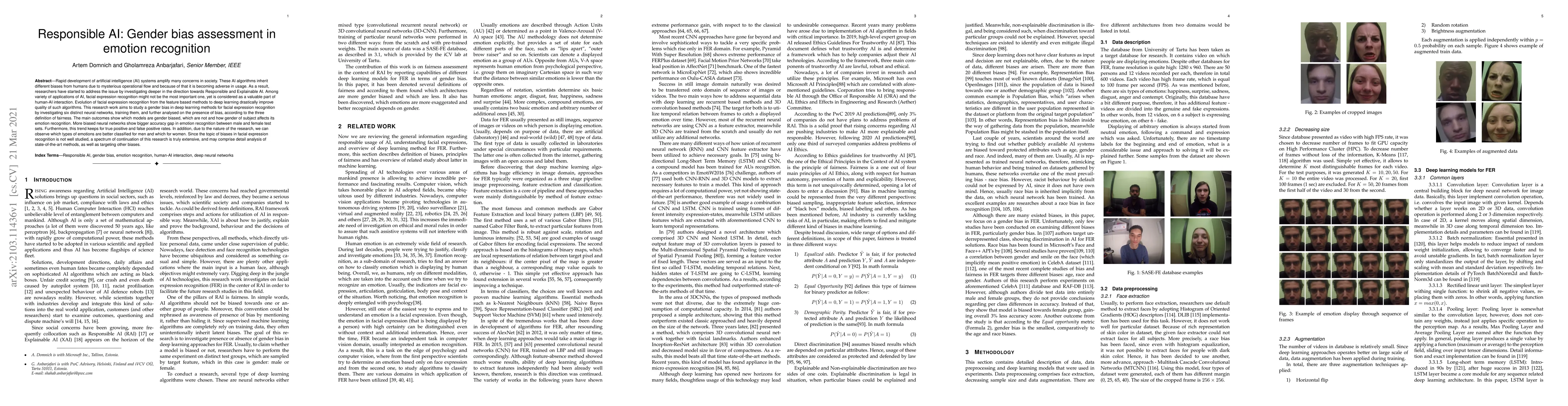 This paper investigates gender bias in deep learning methods for facial expression recognition, analyzing six neural networks for fairness across genders. Results show that more biased models exhibit larger accuracy gaps in emotion recognition between male and female test sets, highlighting the need for responsible AI in human-AI interaction.