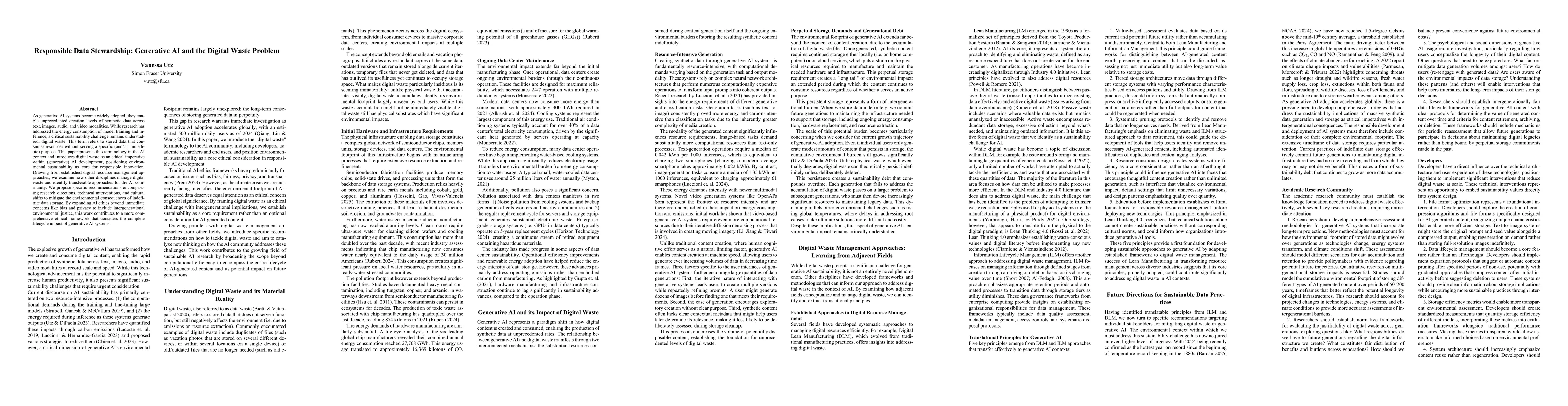 The paper introduces digital waste as an ethical concern in generative AI and proposes transferable approaches from other disciplines to address it.