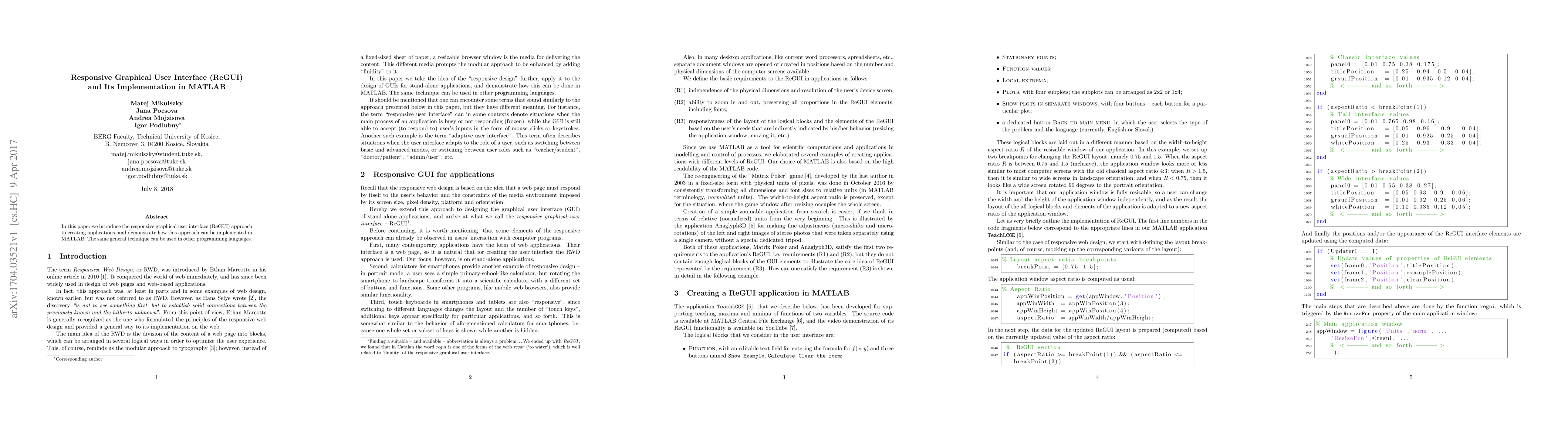 Summary: This paper introduces the responsive graphical user interface (ReGUI) approach for application development and demonstrates its implementation in MATLAB, highlighting its applicability across various programming languages.