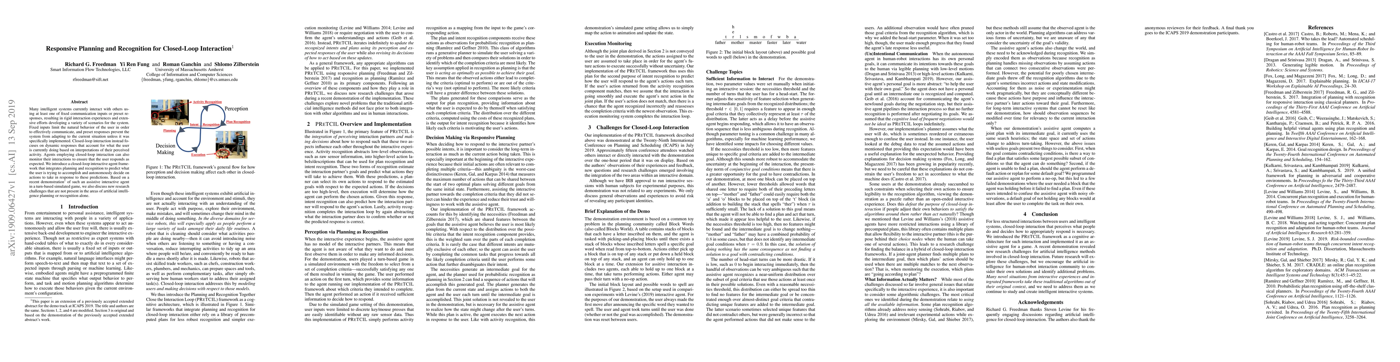 Many intelligent systems currently interact with others using at least one of fixed communication inputs or preset responses, resulting in rigid interaction experiences and extensive efforts developing a variety of scenarios for the system. Fixed inputs limit the natural behavior of the user in order to effectively communicate, and preset responses prevent the system from adapting to the current situation unless it was specifically implemented. Closed-loop interaction instead focuses on dynamic responses that account for what the user is currently doing based on interpretations of their perceived activity. Agents employing closed-loop interaction can also monitor their interactions to ensure that the user responds as expected. We introduce a closed-loop interactive agent framework that integrates planning and recognition to predict what the user is trying to accomplish and autonomously decide on actions to take in response to these predictions. Based on a recent demonstration of such an assistive interactive agent in a turn-based simulated game, we also discuss new research challenges that are not present in the areas of artificial intelligence planning or recognition alone.