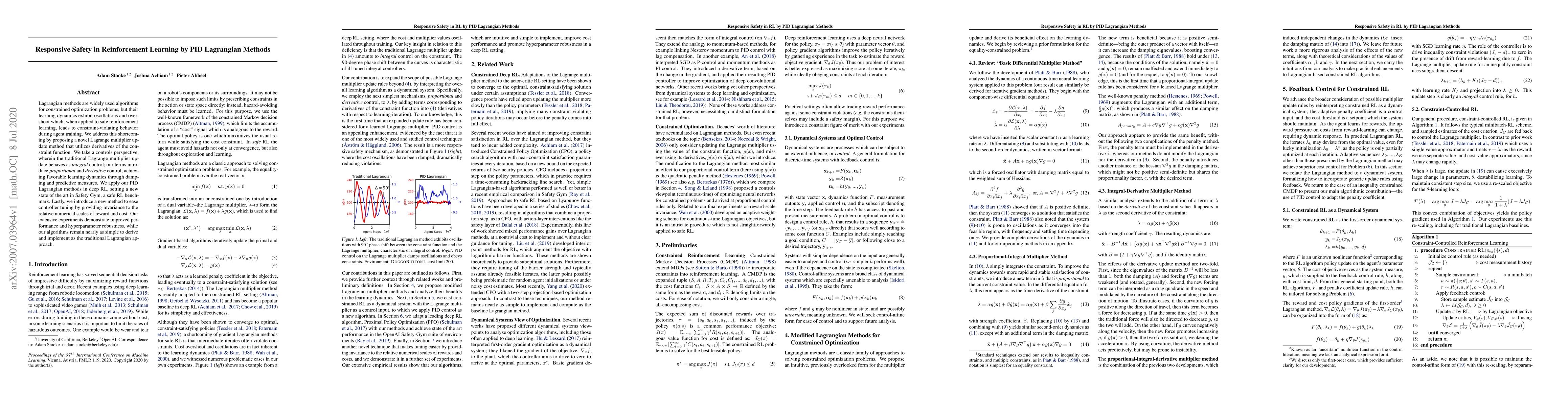 This paper proposes a PID Lagrangian method to improve reinforcement learning dynamics for safe environments by addressing constraint-violating behaviors. The new approach combines integral, proportional, and derivative control to enhance learning stability and performance, achieving state-of-the-art results in the Safety Gym benchmark.