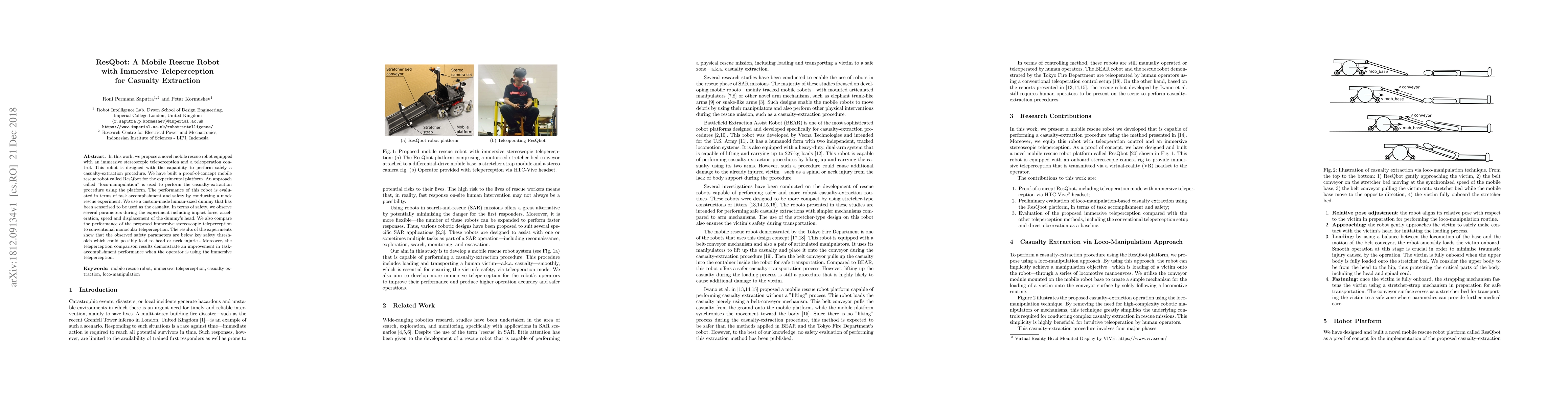 ResQbot is a mobile rescue robot designed for casualty extraction using immersive stereoscopic teleperception and teleoperation. Experiments show it safely performs extraction tasks, with safety parameters below injury thresholds, and outperforms conventional monocular teleperception.