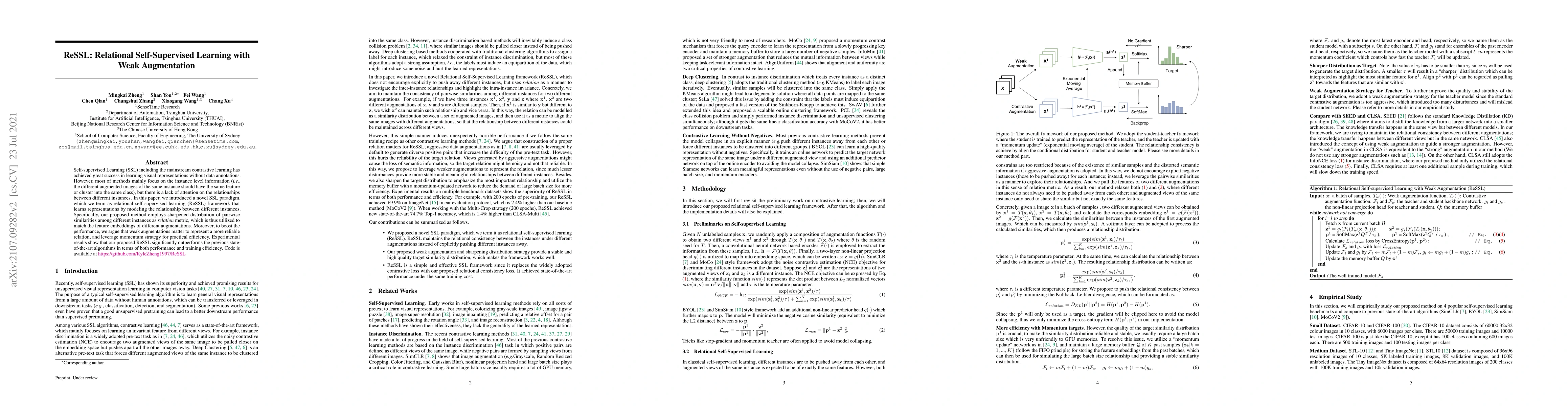 The paper introduces ReSSL, a novel relational self-supervised learning framework that models relationships between different instances to improve visual representation learning. It employs weak augmentations and a momentum strategy to enhance performance and efficiency, outperforming previous methods.