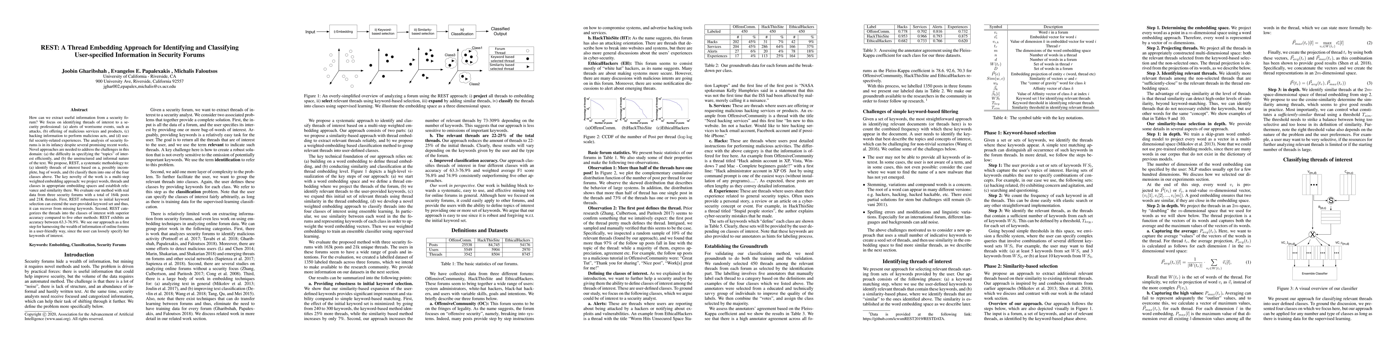 The paper introduces REST, a methodology for identifying and classifying relevant threads in security forums, addressing challenges like inefficient topic specification and informal text. REST uses a multi-step weighted embedding approach, demonstrating robustness to initial keyword selection and superior accuracy (63.3-76.9%) in categorizing threads into four classes: alerts, malicious service offers, hacking information, and security experiences.