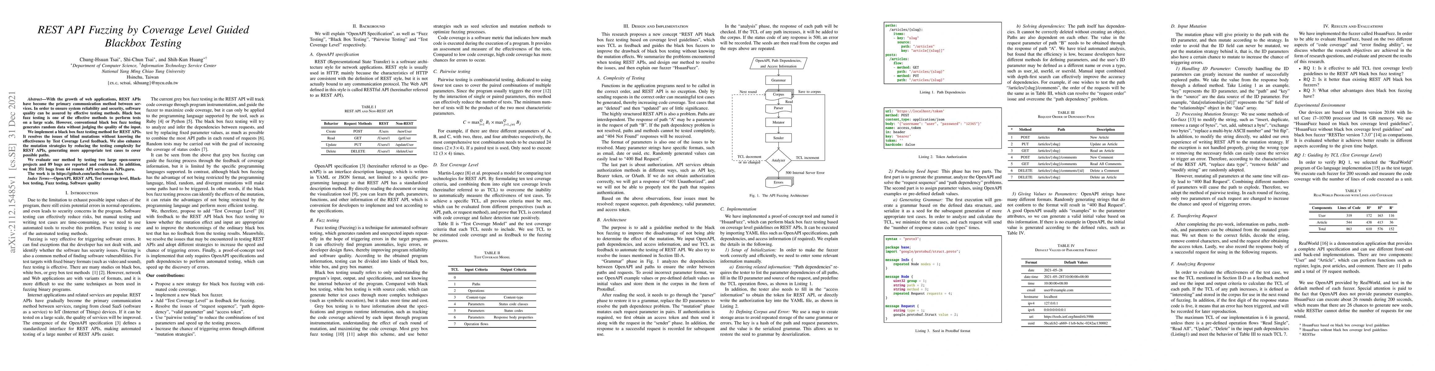 With the growth of web applications, REST APIs have become the primary communication method between services. In order to ensure system reliability and security, software quality can be assured by effective testing methods. Black box fuzz testing is one of the effective methods to perform tests on a large scale. However, conventional black box fuzz testing generates random data without judging the quality of the input. We implement a black box fuzz testing method for REST APIs. It resolves the issues of blind mutations without knowing the effectiveness by Test Coverage Level feedback. We also enhance the mutation strategies by reducing the testing complexity for REST APIs, generating more appropriate test cases to cover possible paths. We evaluate our method by testing two large open-source projects and 89 bugs are reported and confirmed. In addition, we find 351 bugs from 64 remote API services in APIs.guru. The work is in https://github.com/iasthc/hsuan-fuzz.