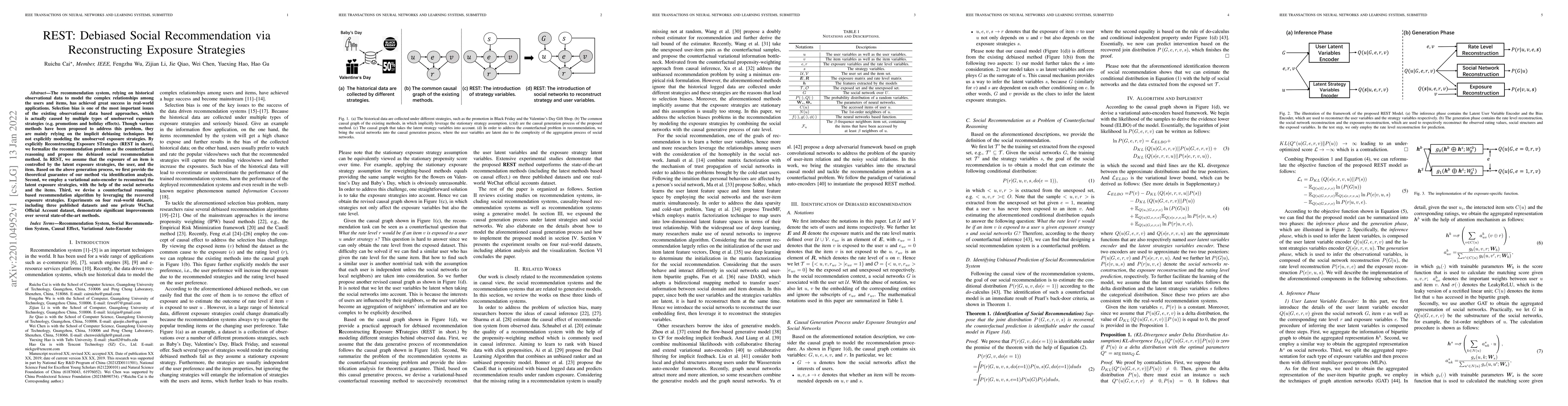 This paper proposes REST, a method to debias social recommendation systems by explicitly modeling unobserved exposure strategies through counterfactual reasoning. The authors use a variational auto-encoder to reconstruct latent exposure strategies and demonstrate significant improvements over existing methods on four real-world datasets.