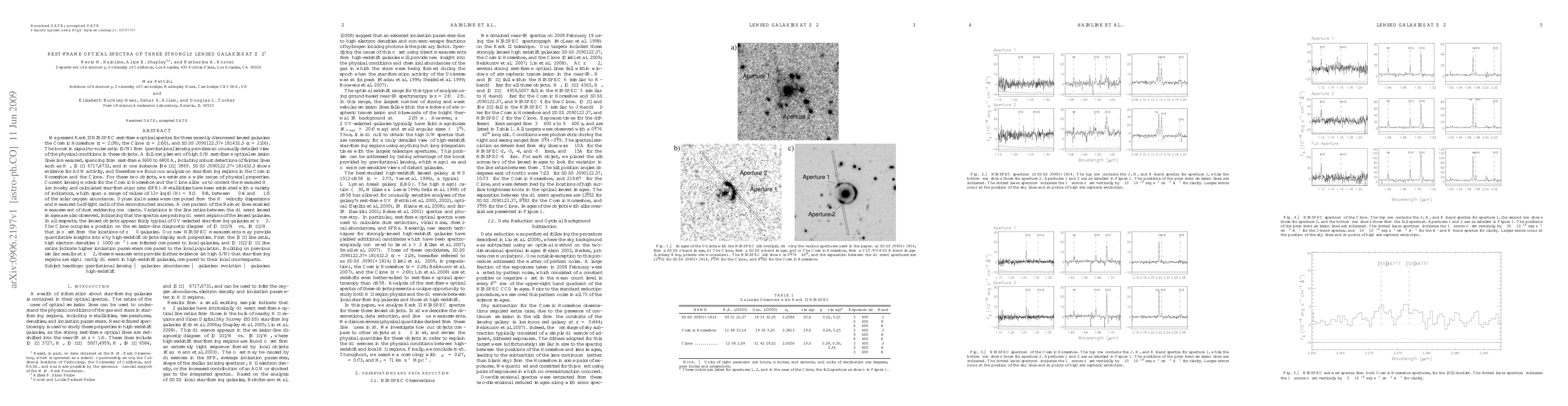 This paper analyzes rest-frame optical spectra of three strongly lensed galaxies at z~2, revealing detailed physical conditions and star-formation properties. The study finds high electron densities and ionization parameters in these galaxies, suggesting significant differences compared to local star-forming regions.