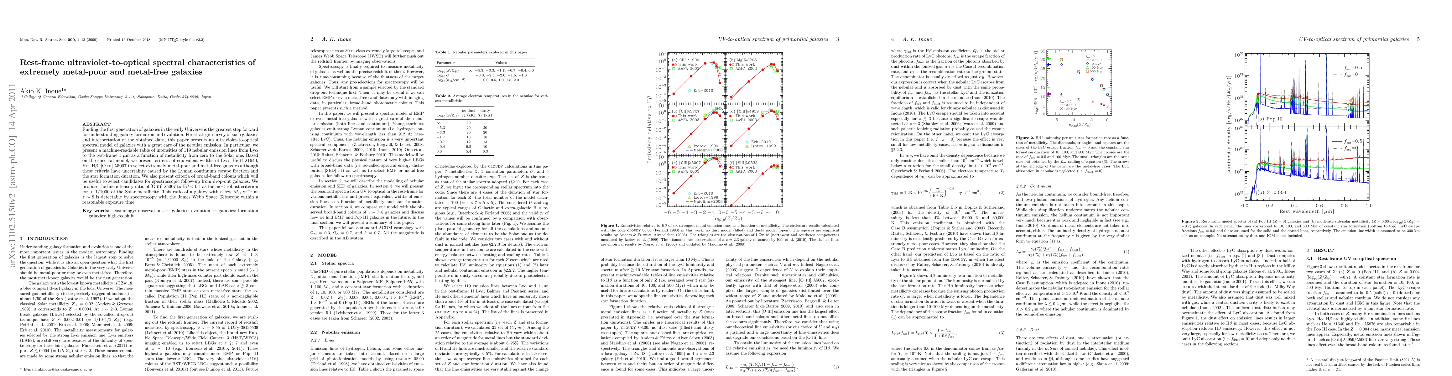 Finding the first generation of galaxies in the early Universe is the greatest step forward for understanding galaxy formation and evolution. For strategic survey of such galaxies and interpretation of the obtained data, this paper presents an ultraviolet-to-optical spectral model of galaxies with a great care of the nebular emission. In particular, we present a machine-readable table of intensities of 119 nebular emission lines from Ly$\alpha$ to the rest-frame 1 $\mu$m as a function of metallicity from zero to the Solar one. Based on the spectral model, we present criteria of equivalent widths of Ly$\alpha$, He {\sc ii} $\lambda1640$, H$\alpha$, H$\beta$, [O {\sc iii}] $\lambda5007$ to select extremely metal-poor and metal-free galaxies although these criteria have uncertainty caused by the Lyman continuum escape fraction and the star formation duration. We also present criteria of broad-band colours which will be useful to select candidates for spectroscopic follow-up from drop-out galaxies. We propose the line intensity ratio of [O {\sc iii}] $\lambda5007$ to H$\beta$ $<0.1$ as the most robust criterion for $<1/1000$ of the Solar metallicity. This ratio of a galaxy with a few $M_\odot$ yr$^{-1}$ at $z\sim8$ is detectable by spectroscopy with the James Webb Space Telescope within a reasonable exposure time.