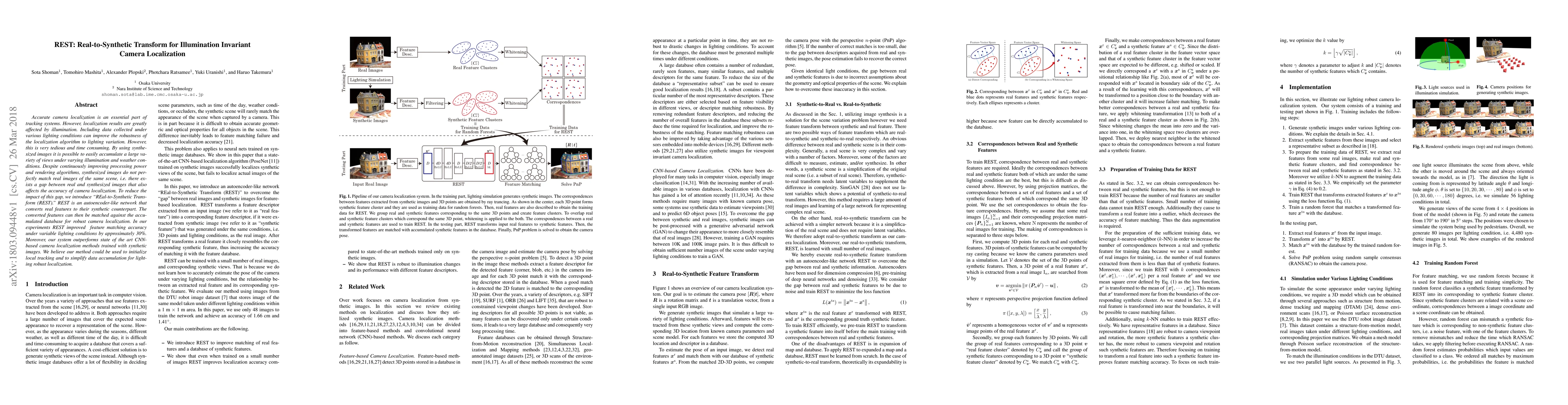 Researchers introduced a new method called Real-to-Synthetic Transform (REST) to improve camera localization accuracy under varying lighting conditions. The system uses an autoencoder-like network to convert real features to synthetic counterparts, achieving a 30% improvement in feature matching accuracy.