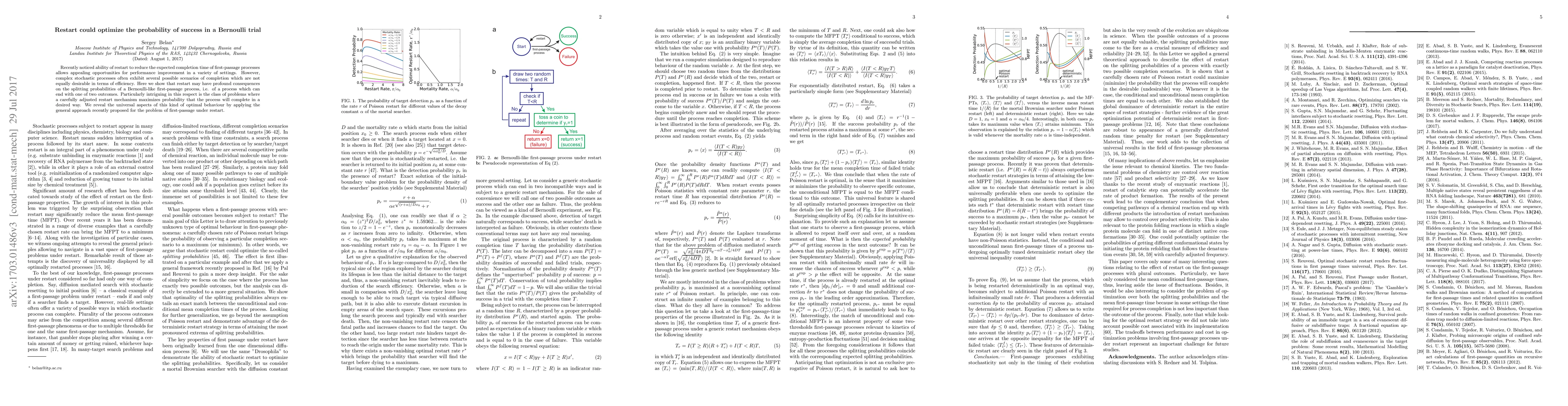 Recently noticed ability of restart to reduce the expected completion time of first-passage processes allows appealing opportunities for performance improvement in a variety of settings. However, complex stochastic processes often exhibit several possible scenarios of completion which are not equally desirable in terms of efficiency. Here we show that restart may have profound consequences on the splitting probabilities of a Bernoulli-like first-passage process, i.e. of a process which can end with one of two outcomes. Particularly intriguing in this respect is the class of problems where a carefully adjusted restart mechanism maximizes probability that the process will complete in a desired way. We reveal the universal aspects of this kind of optimal behaviour by applying the general approach recently proposed for the problem of first-passage under restart.