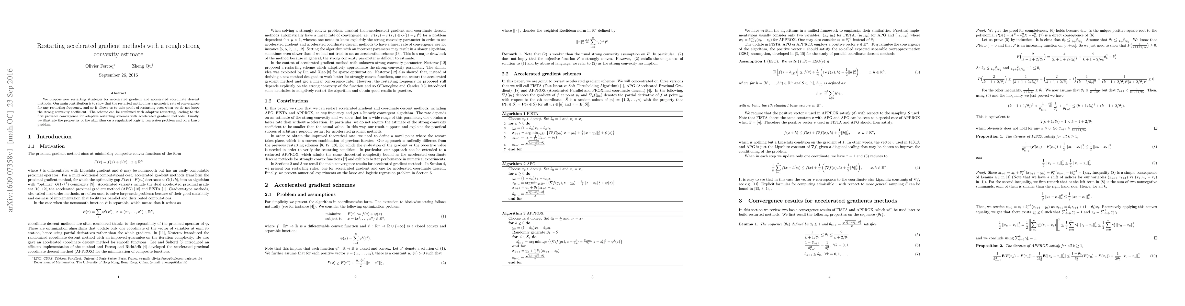We propose new restarting strategies for accelerated gradient and accelerated coordinate descent methods. Our main contribution is to show that the restarted method has a geometric rate of convergence for any restarting frequency, and so it allows us to take profit of restarting even when we do not know the strong convexity coefficient. The scheme can be combined with adaptive restarting, leading to the first provable convergence for adaptive restarting schemes with accelerated gradient methods. Finally, we illustrate the properties of the algorithm on a regularized logistic regression problem and on a Lasso problem.