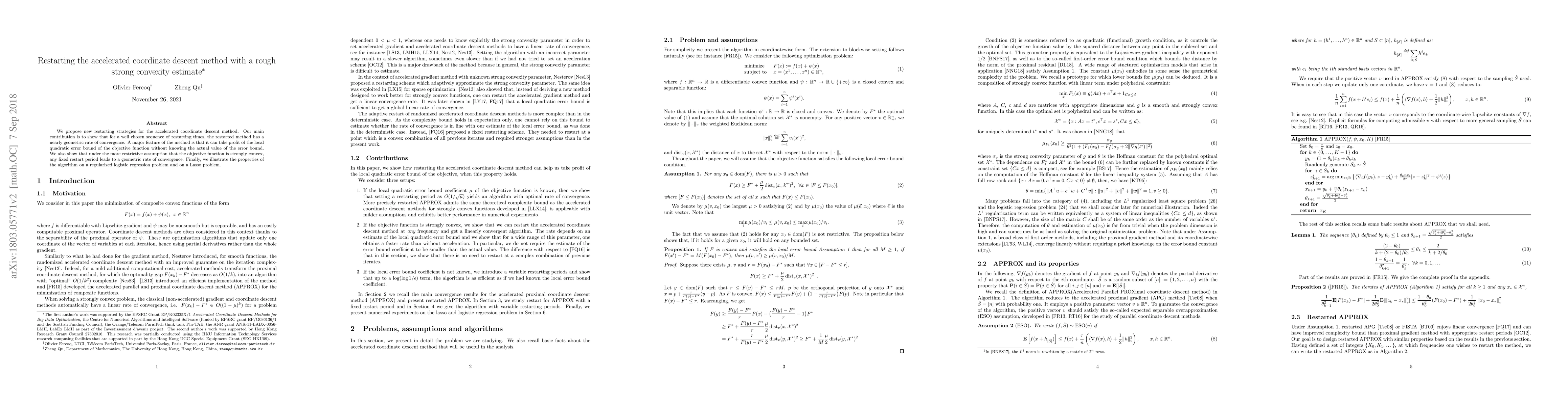 This paper proposes new restarting strategies for the accelerated coordinate descent method, demonstrating nearly geometric convergence rates through a well-chosen sequence of restarting times. It leverages local quadratic error bounds without requiring their exact values, and shows geometric convergence under strong convexity assumptions.
