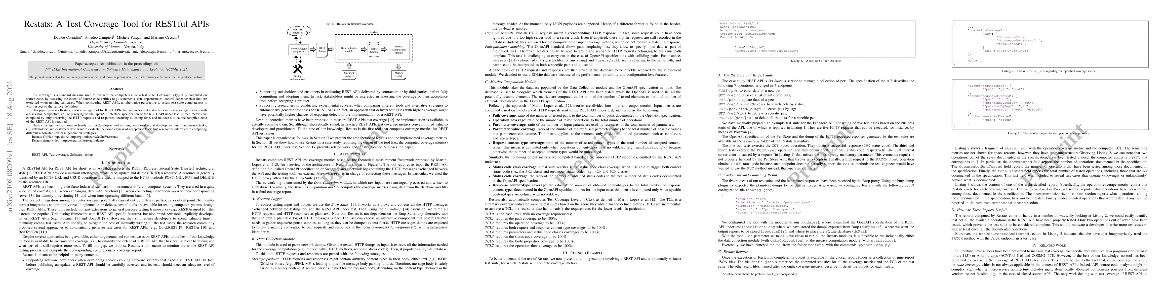 Restats is a tool for assessing test coverage of RESTful APIs using black-box testing methods based on OpenAPI specifications, without requiring access to source code. It provides eight advanced coverage metrics to evaluate the completeness of API tests for developers, stakeholders, and researchers.