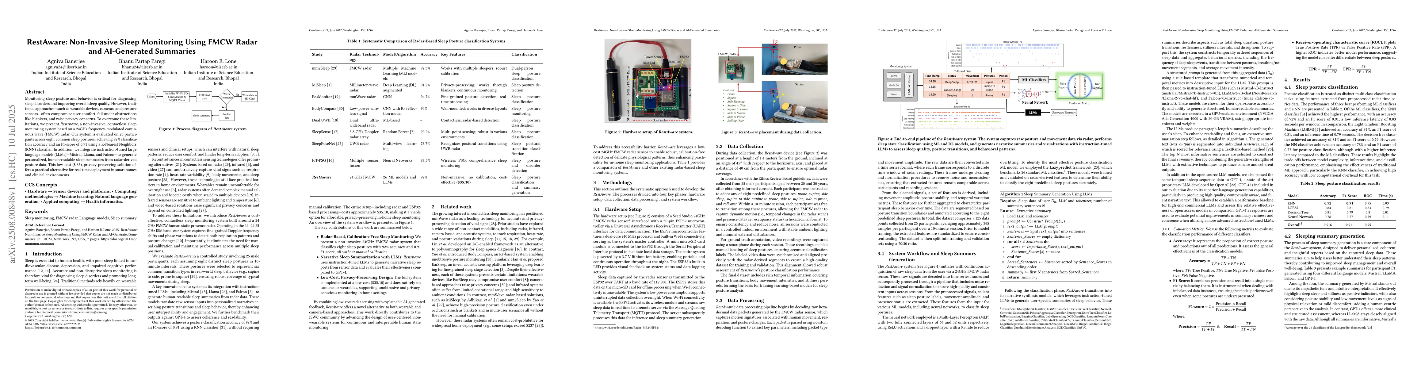 Monitoring sleep posture and behavior is critical for diagnosing sleep disorders and improving overall sleep quality. However, traditional approaches, such as wearable devices, cameras, and pressure sensors, often compromise user comfort, fail under obstructions like blankets, and raise privacy concerns. To overcome these limitations, we present RestAware, a non-invasive, contactless sleep monitoring system based on a 24GHz frequency-modulated continuous wave (FMCW) radar. Our system is evaluated on 25 participants across eight common sleep postures, achieving 92% classification accuracy and an F1-score of 0.91 using a K-Nearest Neighbors (KNN) classifier. In addition, we integrate instruction-tuned large language models (Mistral, Llama, and Falcon) to generate personalized, human-readable sleep summaries from radar-derived posture data. This low-cost ($ 35), privacy-preserving solution offers a practical alternative for real-time deployment in smart homes and clinical environments.