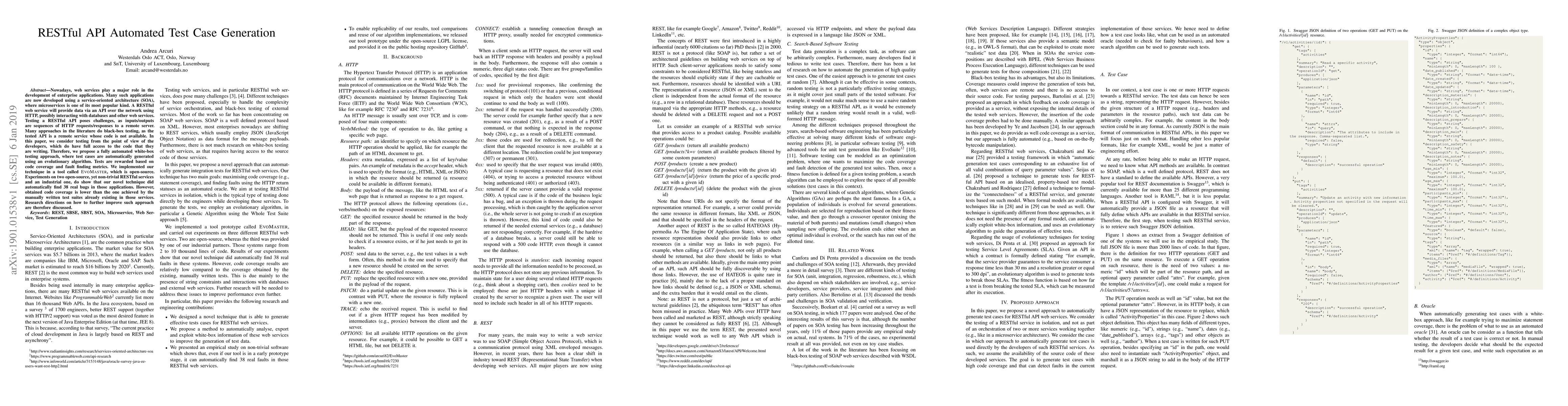 This paper proposes an automated white-box testing approach for RESTful APIs using an evolutionary algorithm to generate test cases, focusing on code coverage and fault detection. The tool EVOMASTER, developed to implement this technique, found 38 real bugs in tested services but achieved lower code coverage than existing manual test suites.