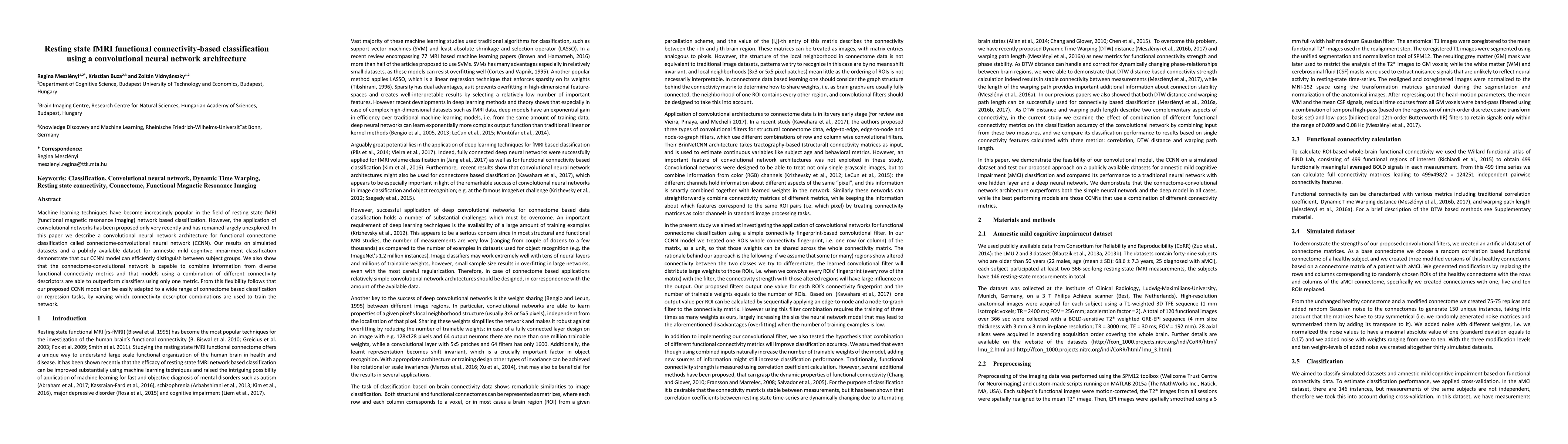 This paper proposes a convolutional neural network architecture called connectome-convolutional neural network (CCNN) for classifying resting state fMRI functional connectivity data. The CCNN model effectively distinguishes between subject groups in amnestic mild cognitive impairment classification and outperforms models using single connectivity metrics, demonstrating its adaptability to various classification tasks.