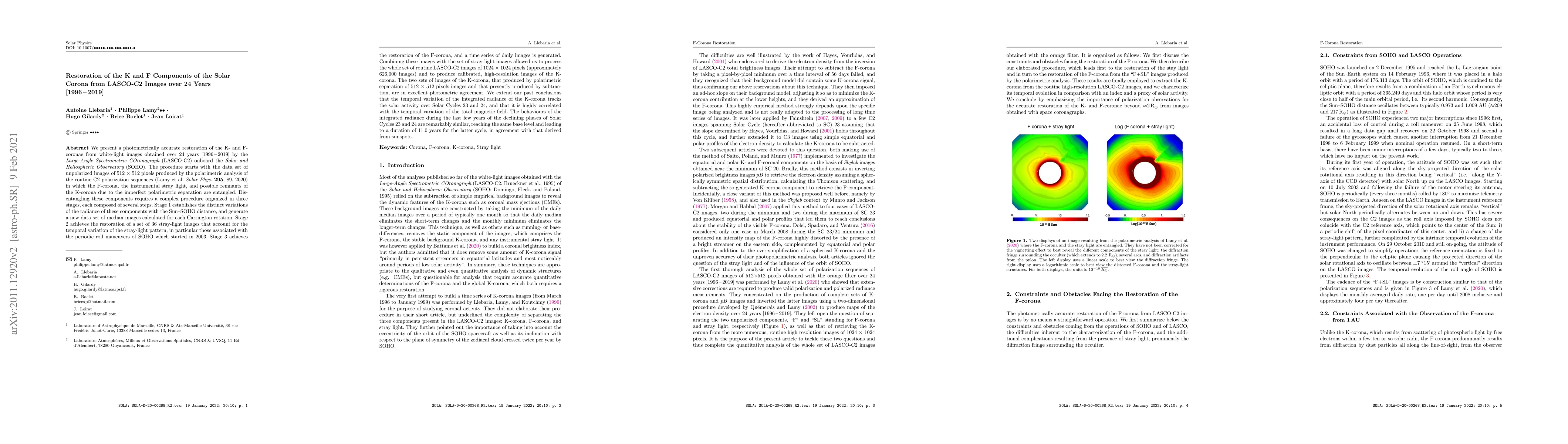 We present a photometrically accurate restitution of the K and F coronae from white-light images obtained over 24 Years [1996--2019] by the Large-Angle Spectrometric COronagraph "LASCO-C2" onboard the Solar and Heliospheric Observatory (SOHO). The procedure starts with the data set coming from the polarimetric separation of images of 512 x 512 pixels in which the F-corona and the instrumental stray light are entangled. Disentangling these components proceeds in three stages, each composed of several steps. Stage 1 establishes the distinct variations of the radiance of these components with the Sun--SOHO distance and generate a new data set of median images calculated for each Carrington rotation. Stage 2 achieves the restitution of a set of 36 stray light images reflecting its temporal variation and the periodic rolls of SOHO which started in 2003. Stage 3 achieves the restitution of the F-corona and a time series of daily images is generated. These results allowed us processing the whole set of routine LASCO-C2 images of 1024 x 1024 pixels (approximately 626000 images) and producing calibrated, high resolution images of the K-corona. We extend our past conclusions that the temporal variation of the integrated radiance of the K-corona tracks the solar activity over two solar cycles 23 and 24 and that it is highly correlated with the temporal variation of the total magnetic field. The behaviours of the integrated radiance during the last few years of the declining phases of solar cycles 23 and 24 are remarkably similar, reaching the same floor level and leading to a duration of 11.0 year for the latter cycle, in agreement with the sunspot determination.
