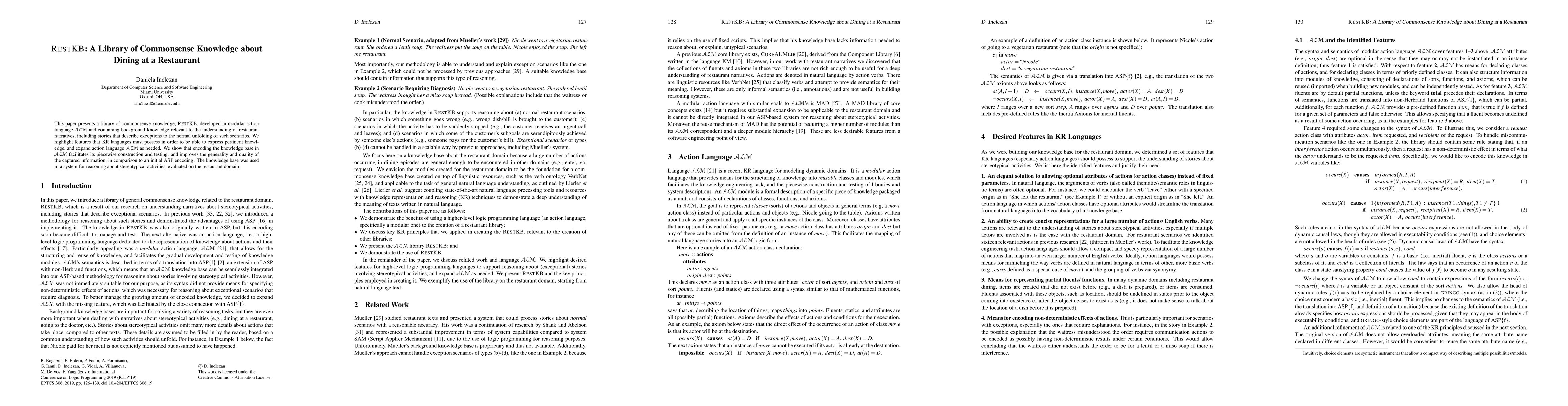 The research presents RestKB, a library of commonsense knowledge about dining at a restaurant, developed in the modular action language ALM. The library includes background knowledge relevant to restaurant narratives, including exceptions to normal scenarios, and was used in a system for reasoning about stereotypical activities in the restaurant domain.