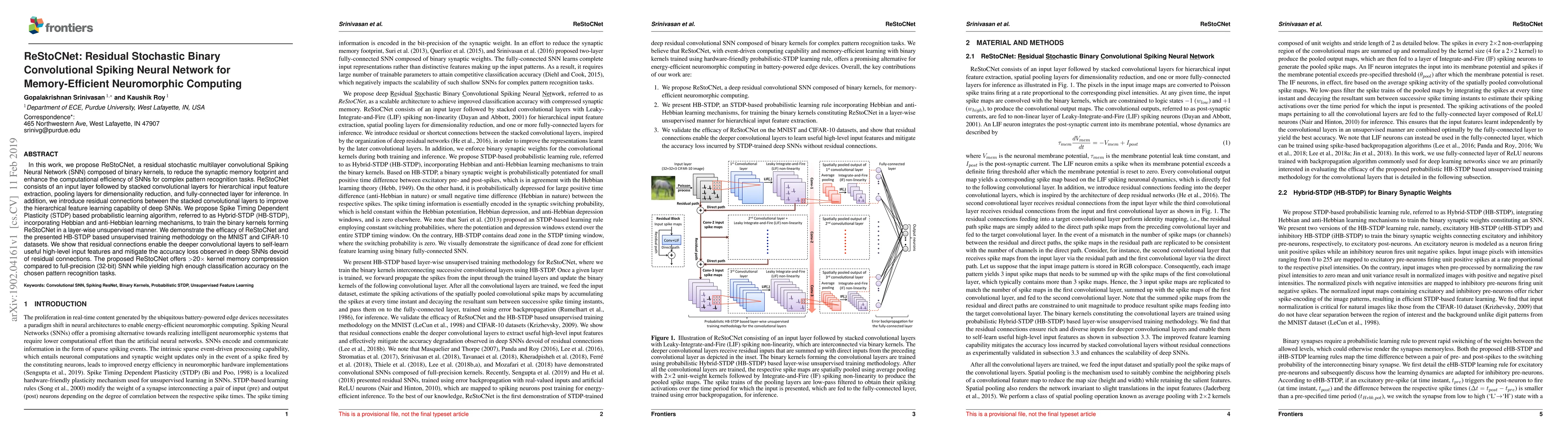 ReStoCNet is a memory-efficient residual stochastic binary convolutional Spiking Neural Network designed for complex pattern recognition. It employs residual connections and a Hybrid-STDP learning algorithm to achieve >20x kernel memory compression while maintaining high classification accuracy on MNIST and CIFAR-10 datasets.