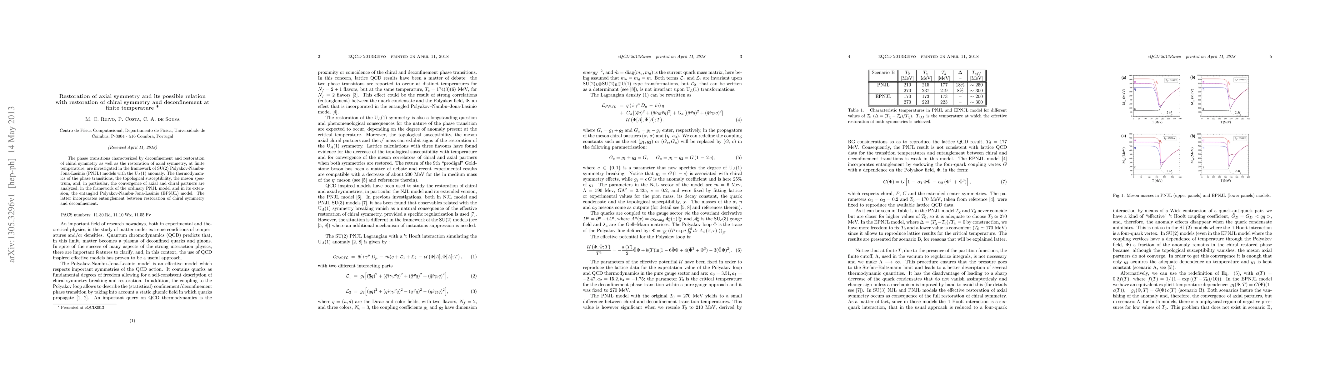 The phase transitions characterized by deconfinement and restoration of chiral symmetry as well as the restoration of axial symmetry, at finite temperature, are investigated in the framework of SU(2) Polyakov-Nambu-Jona-Lasinio (PNJL) models with the U$_A$(1) anomaly. The thermodynamics of the phase transitions, the topological susceptibility, the meson spectrum, and, in particular, the convergence of axial and chiral partners are analyzed, in the framework of the ordinary PNJL model and in its extension, the entangled Polyakov-Nambu-Jona-Lasinio (EPNJL) model. The latter incorporates entanglement between restoration of chiral symmetry and deconfinement.
