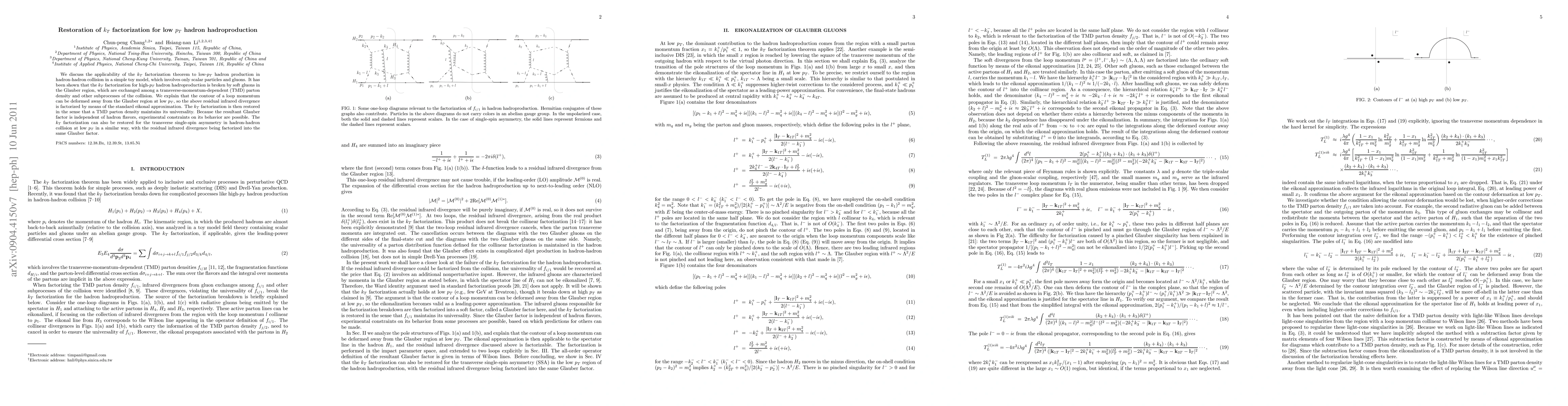 We discuss the applicability of the $k_T$ factorization theorem to low-$p_T$ hadron production in hadron-hadron collision in a simple toy model, which involves only scalar particles and gluons. It has been shown that the $k_T$ factorization for high-$p_T$ hadron hadroproduction is broken by soft gluons in the Glauber region, which are exchanged among a transverse-momentum-dependent (TMD) parton density and other subprocesses of the collision. We explain that the contour of a loop momentum can be deformed away from the Glauber region at low $p_T$, so the above residual infrared divergence is factorized by means of the standard eikonal approximation. The $k_T$ factorization is then restored in the sense that a TMD parton density maintains its universality. Because the resultant Glauber factor is independent of hadron flavors, experimental constraints on its behavior are possible. The $k_T$ factorization can also be restored for the transverse single-spin asymmetry in hadron-hadron collision at low $p_T$ in a similar way, with the residual infrared divergence being factorized into the same Glauber factor.