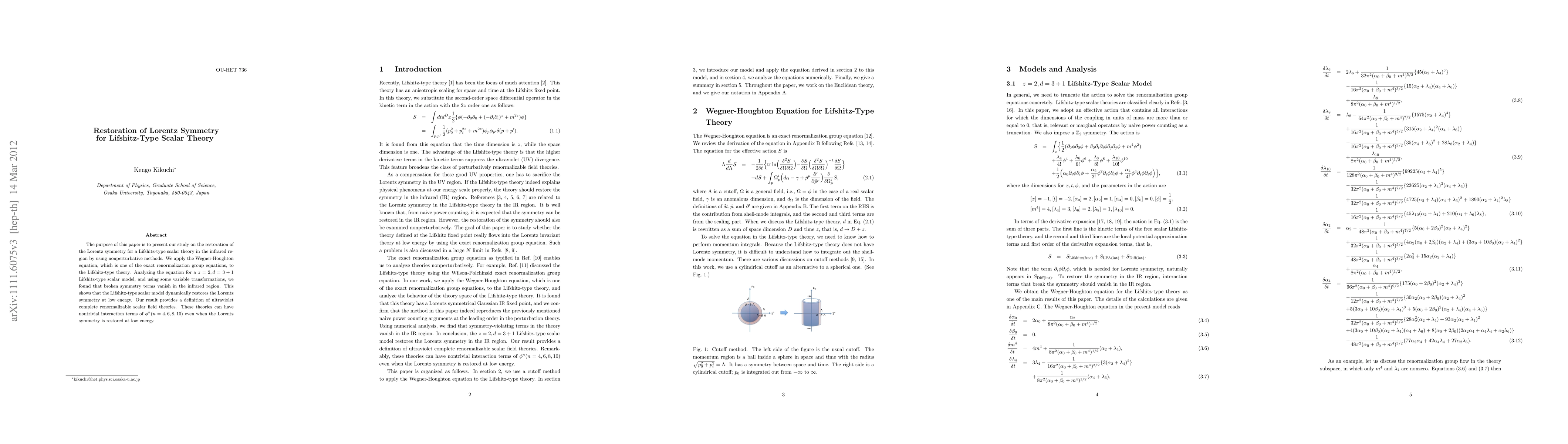 This paper investigates the restoration of Lorentz symmetry in a Lifshitz-type scalar theory using nonperturbative methods and the Wegner-Houghton equation. The study reveals that broken symmetry terms vanish in the infrared region, indicating the dynamic restoration of Lorentz symmetry at low energy.