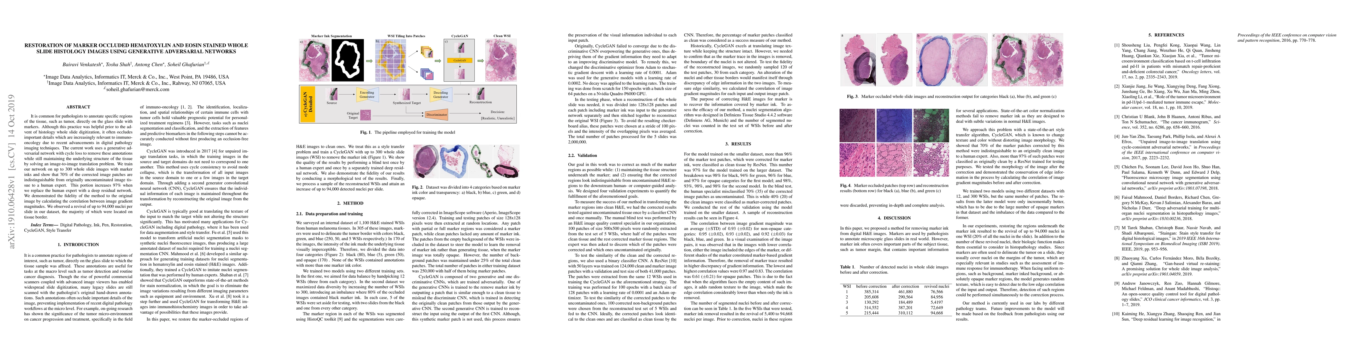 It is common for pathologists to annotate specific regions of the tissue, such as tumor, directly on the glass slide with markers. Although this practice was helpful prior to the advent of histology whole slide digitization, it often occludes important details which are increasingly relevant to immuno-oncology due to recent advancements in digital pathology imaging techniques. The current work uses a generative adversarial network with cycle loss to remove these annotations while still maintaining the underlying structure of the tissue by solving an image-to-image translation problem. We train our network on up to 300 whole slide images with marker inks and show that 70% of the corrected image patches are indistinguishable from originally uncontaminated image tissue to a human expert. This portion increases 97% when we replace the human expert with a deep residual network. We demonstrated the fidelity of the method to the original image by calculating the correlation between image gradient magnitudes. We observed a revival of up to 94,000 nuclei per slide in our dataset, the majority of which were located on tissue border.