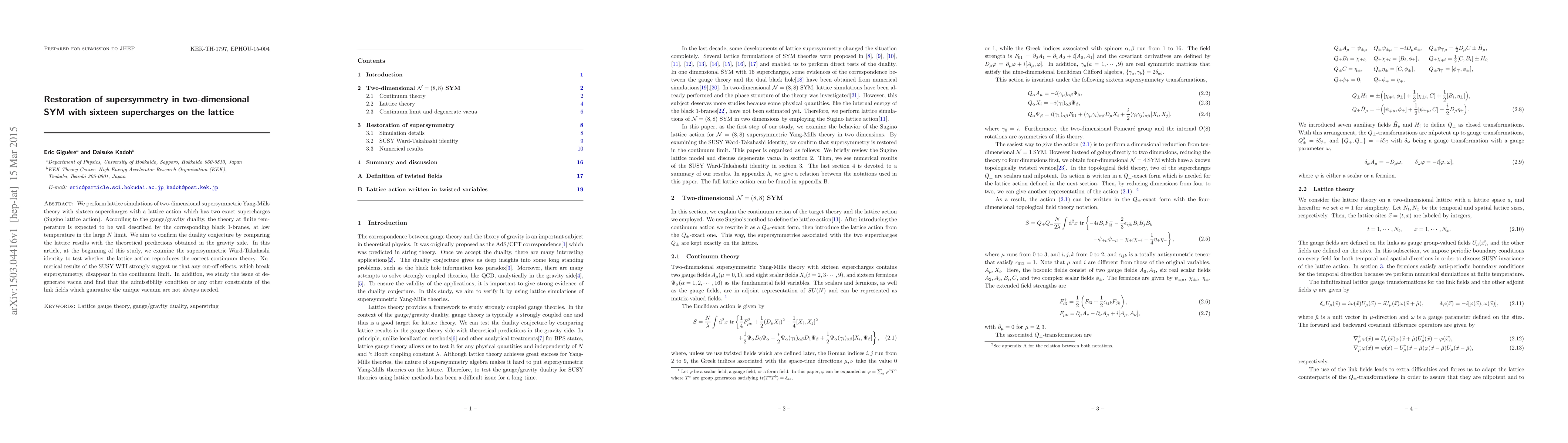 We perform lattice simulations of two-dimensional supersymmetric Yang-Mills theory with sixteen supercharges with a lattice action which has two exact supercharges (Sugino lattice action). According to the gauge/gravity duality, the theory at finite temperature is expected to be well described by the corresponding black 1-branes, at low temperature in the large N limit. We aim to confirm the duality conjecture by comparing the lattice results with the theoretical predictions obtained in the gravity side. In this article, at the beginning of this study, we examine the supersymmetric Ward-Takahashi identity to test whether the lattice action reproduces the correct continuum theory. Numerical results of the SUSY WTI strongly suggest us that any cut-off effects, which break supersymmetry, disappear in the continuum limit. In addition, we study the issue of degenerate vacua and find that the admissiblilty condition or any other constraints of the link fields which guarantee the unique vacuum are not always needed.