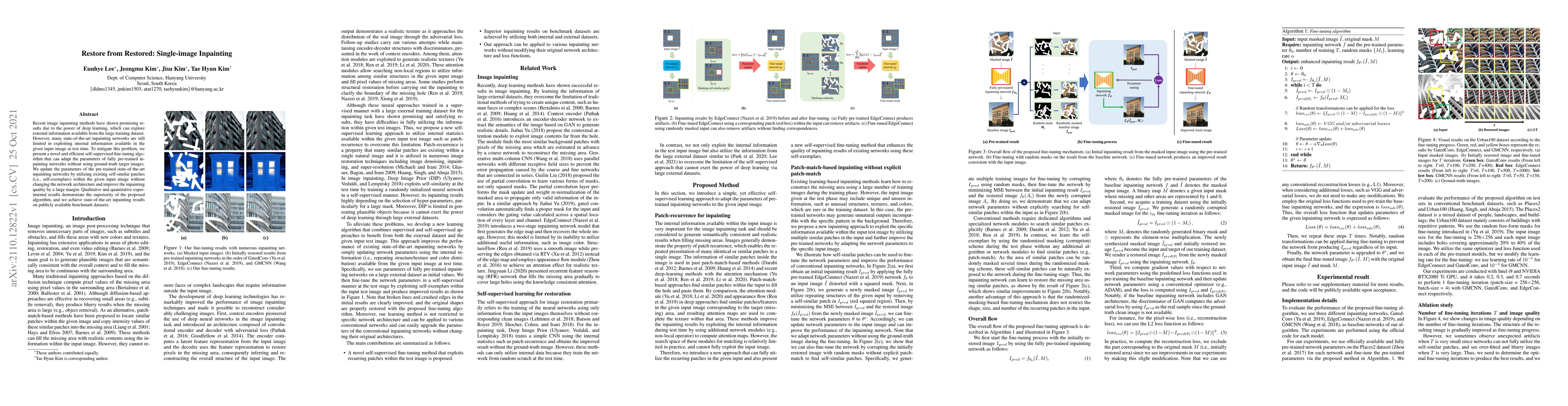 This paper proposes a self-supervised fine-tuning algorithm to enhance single-image inpainting by leveraging self-similar patches within the input image, improving the quality of inpainting without altering the network architecture. The method achieves state-of-the-art results on benchmark datasets, demonstrating significant improvements over existing methods.