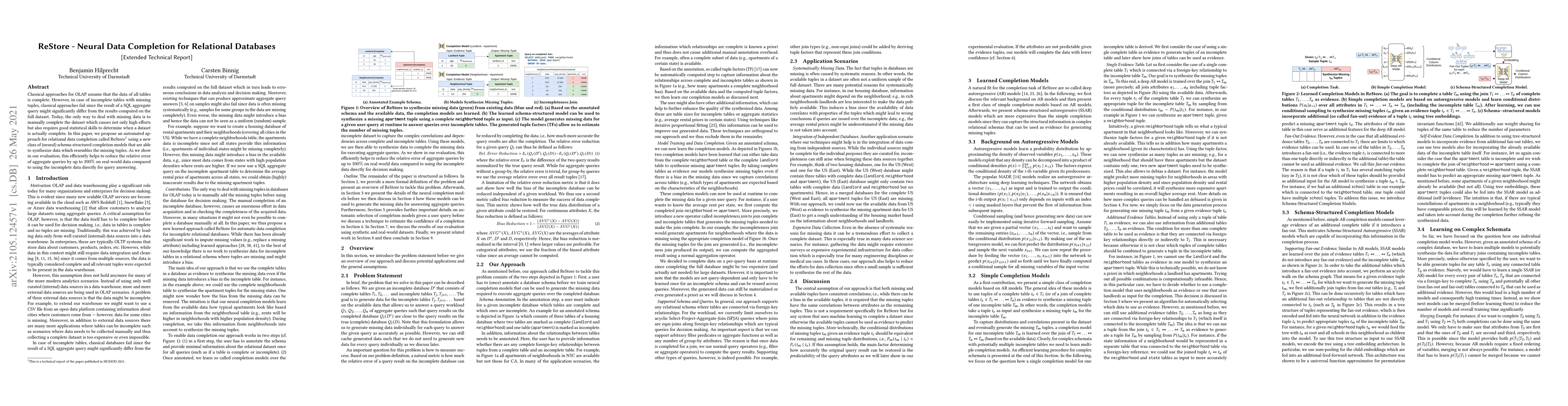 Classical approaches for OLAP assume that the data of all tables is complete. However, in case of incomplete tables with missing tuples, classical approaches fail since the result of a SQL aggregate query might significantly differ from the results computed on the full dataset. Today, the only way to deal with missing data is to manually complete the dataset which causes not only high efforts but also requires good statistical skills to determine when a dataset is actually complete. In this paper, we propose an automated approach for relational data completion called ReStore using a new class of (neural) schema-structured completion models that are able to synthesize data which resembles the missing tuples. As we show in our evaluation, this efficiently helps to reduce the relative error of aggregate queries by up to 390% on real-world data compared to using the incomplete data directly for query answering.