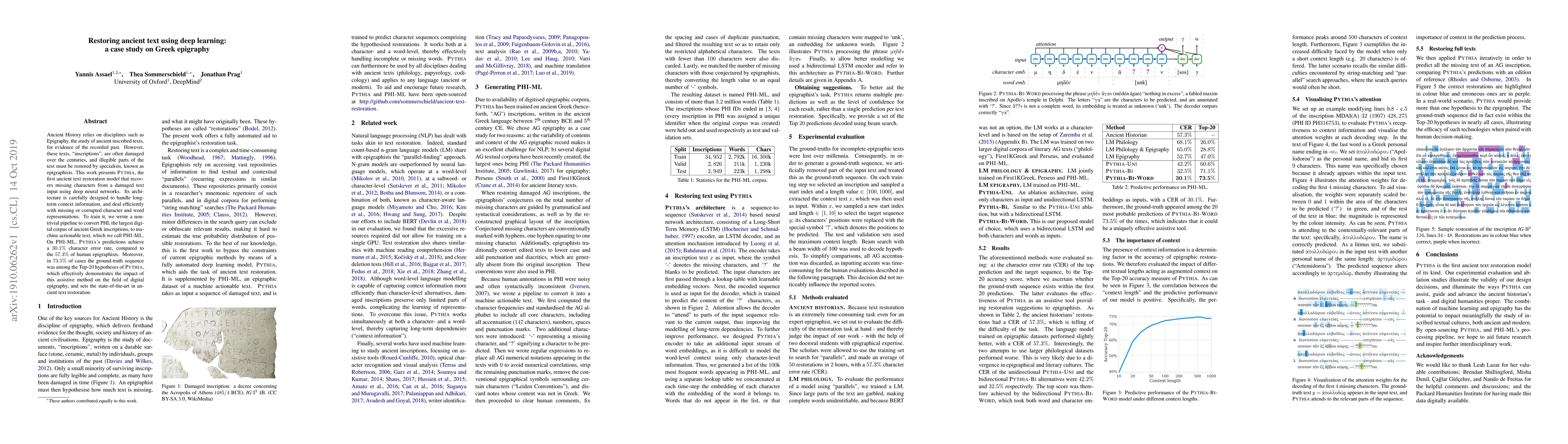 This paper introduces Pythia, a deep learning model for restoring damaged ancient Greek inscriptions, achieving a 30.1% character error rate and outperforming human epigraphists. The model is trained on a specially prepared dataset, PHI-ML, derived from the largest digital corpus of ancient Greek inscriptions.
