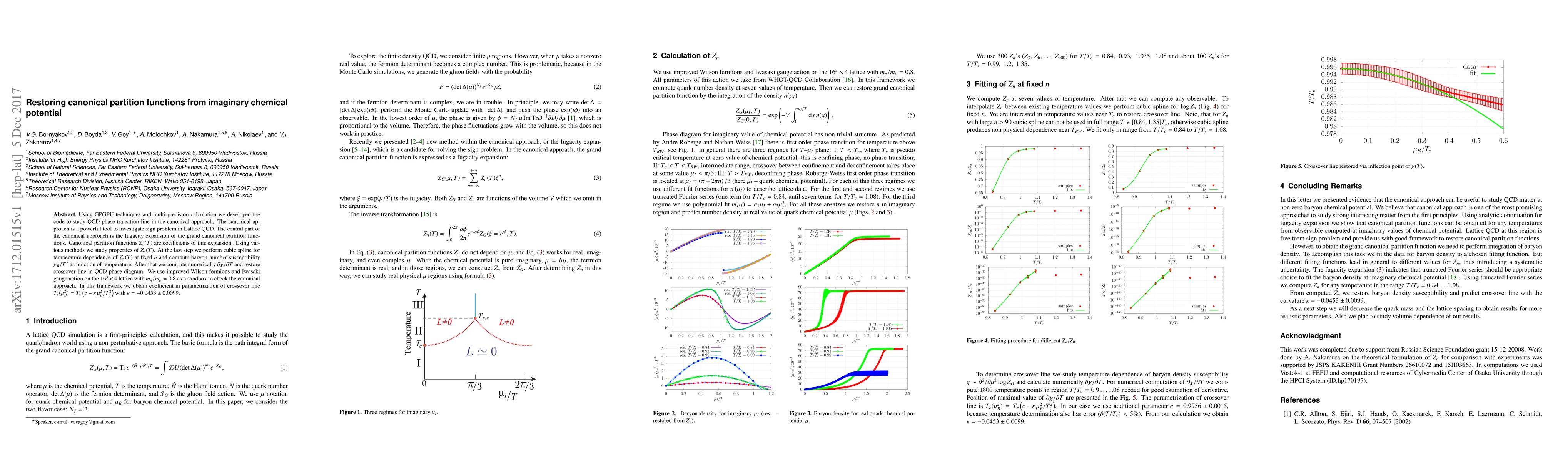 Using GPGPU techniques and multi-precision calculation we developed the code to study QCD phase transition line in the canonical approach. The canonical approach is a powerful tool to investigate sign problem in Lattice QCD. The central part of the canonical approach is the fugacity expansion of the grand canonical partition functions. Canonical partition functions $Z_n(T)$ are coefficients of this expansion. Using various methods we study properties of $Z_n(T)$. At the last step we perform cubic spline for temperature dependence of $Z_n(T)$ at fixed $n$ and compute baryon number susceptibility $\chi_B/T^2$ as function of temperature. After that we compute numerically $\partial\chi/ \partial T$ and restore crossover line in QCD phase diagram. We use improved Wilson fermions and Iwasaki gauge action on the $16^3 \times 4$ lattice with $m_{\pi}/m_{\rho} = 0.8$ as a sandbox to check the canonical approach. In this framework we obtain coefficient in parametrization of crossover line $T_c(\mu_B^2)=T_c\left(c-\kappa\, \mu_B^2/T_c^2\right)$ with $\kappa = -0.0453 \pm 0.0099$.