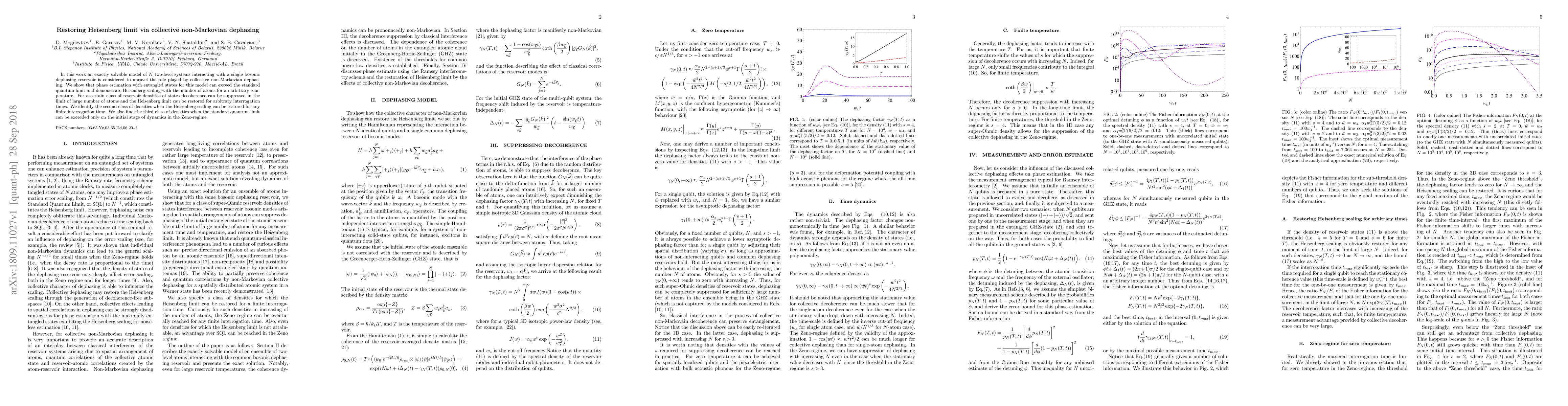 This paper explores the restoration of the Heisenberg limit in phase estimation through collective non-Markovian dephasing in a model of N entangled two-level systems interacting with a bosonic reservoir. It shows that under certain conditions, the Heisenberg scaling can be achieved for arbitrary interrogation times, surpassing the standard quantum limit.