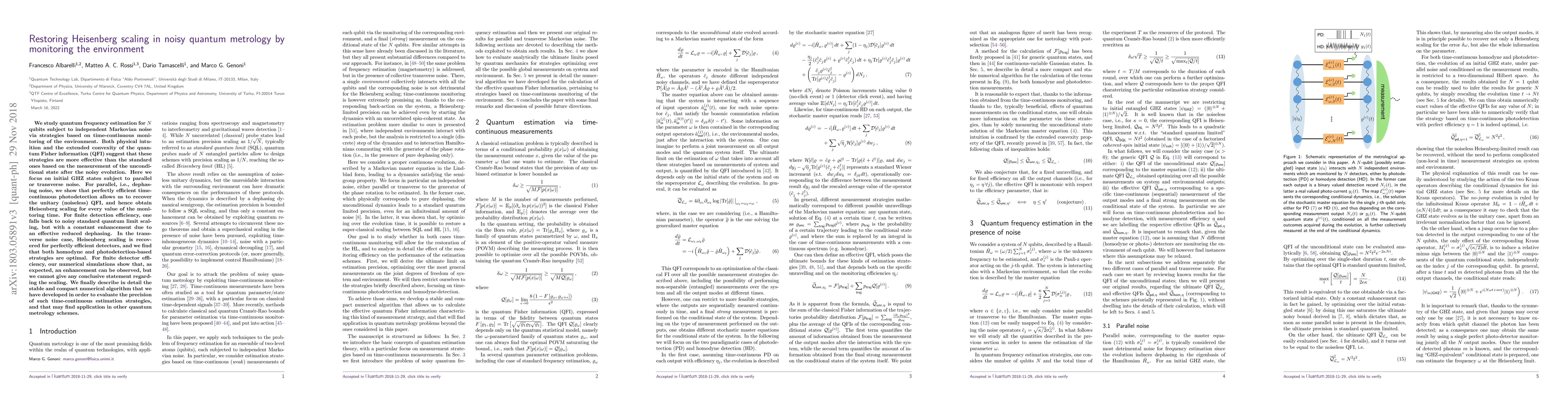 This research presents strategies for quantum frequency estimation with N qubits under Markovian noise, using continuous environment monitoring. It shows that perfect detection allows for Heisenberg scaling and noiseless QFI recovery in both parallel and transverse noise cases. Even with finite detection efficiency, there's an enhancement due to reduced dephasing. The paper also introduces a stable algorithm for evaluating the precision of these strategies in quantum metrology.